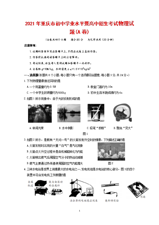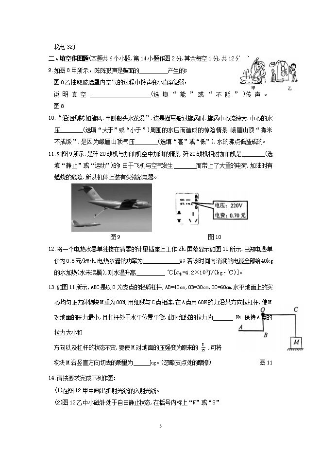 【内容简介】9.赣州的夏天气候炎热,小明家的太阳能热水器每到傍晚时的温度都近 ,这是通过________的方式使水的内能___________(选填“增加”或“减少”)。10.如图所示,是一瓶 100mL医用 75%的酒精消毒液,将它喷洒在衣物上,站在附近能够闻到浓浓的刺鼻味道,这是______现象。如果将一整瓶该消毒液与100mL 的水混合,总体积将会______(选填“大于”“小于”或“等于”)200mL, 这是因为分子间存在______。 11.小明发现,打开电冰箱冷藏室门时,冰箱内的照明灯泡就发光,此时“冰箱门”相当于一个______;夏天,打开电冰箱冷冻室的门,立即见到冒出“白气”,这属于______(填物态变化)现象。12.捏面人和糖画是中国传统民间技艺。如图,捏好的面人在太阳光的照射下,温度升高,这是通过________方式改变了面人的内能。如图,做糖画时,将糖浆浇在平滑的石板上,糖浆凝固成美丽糖画的过程,需要________(选填“吸热”或“放热”)。 13.在用“伏安法测电阻”实验中,电流表接了0~0.6A的量程,但小军发现此量程刻度线的数字模糊不清,于是他采用0~3A的量程读出了电流值为1.5A,则电路中的实际电流为_______A。14.把少许泡沫粒放在干燥的塑料瓶中,快速摇晃后,泡沫粒很难被倒出,这是泡沫粒与瓶壁摩擦带上_______互相吸引的缘故;此时泡沫粒相对于瓶壁是________的。15.据网上消息,女大学生发明的“爬楼”自行车,3分钟爬20层楼,速度堪比电梯(如图所示)。若该使用者质量为60kg,3分钟爬楼高度为60m,当她匀速上楼时,她的机械能将___________(选填“变大”“变小”或“不变”),她“爬楼”的功率为250W。则她爬楼的效率为___________%( 取 )。 16.如图是内燃机的________冲程,活塞下降时,燃气内能___________(选填“减少”或“增加”),如果一台单缸四冲程内燃机飞轮的转速是2400r/min,则1s内该内燃机做功________次。 17.2021 年5月 15 日,中国天问一号着陆巡视器成功着陆于火星乌托邦平原南部预选着陆区,我国首次火星探测任务着陆火星取得圆满成功。着陆巡视器在接近地面时,速度不断减小直至降为 0,这说明力可以改变物体的________;着陆巡视器减速时,不会立即停下来,是由于它具有________;如图所示,着陆巡视器的“大脚掌”可________(填“减小”或“增大”)其对火星表面的压强。 18.初夏的贵阳,天气凉爽,日平均气温在20℃左右,此温度______(选填“高于”或“低于”)人的正常体温,但在寒冷的冬天,人们常用搓摩双手的方法保暖,这是通过______改变物体的内能。如果将10kg 、20℃的水加热到40℃,需吸收_____J的热量。三、实验题:每空1分,共23分。
