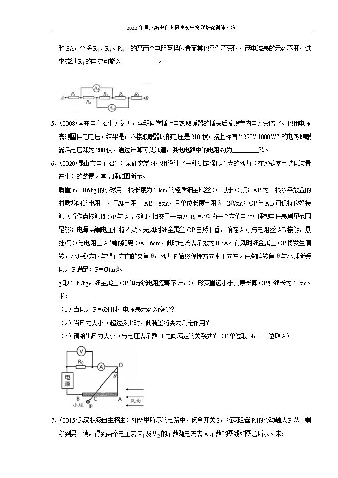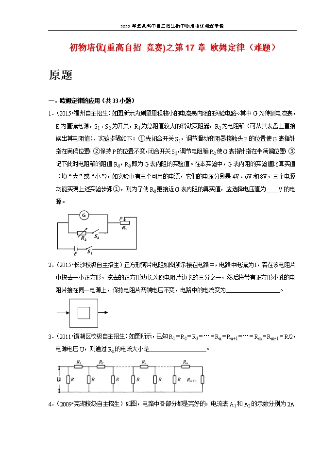 【内容简介】一.欧姆定律的应用(共33小题)1.(2015•福州自主招生)如图所示为测量量程较小的电流表内阻的实验电路。其中G为待测电流表,E为直流电源,S1、S2为开关,R1为总阻值较大的滑动变阻器,R2为电阻箱(可从其表盘上直接读出其电阻值).实验步骤如下:①先闭合开关S1,调节滑动变阻器接触头P的位置使G表指针指在满偏位置;②保持P的位置不变,闭合开关S2,调节电阻箱R2使G表指针指在半满偏位置;③记下此时电阻箱的阻值R0,R0即为G表内阻的实验值。在本实验中,G表内阻的实验值比真实值 (填“大”或“小”),如实验中有三个可用的电源,它们的电压分别是4V、6V和8V,三个电源均能实现上述实验步骤①,则为了使R0更接近G表内阻的真实值,应选择电压值为 V的电源。 2.(2015•长沙校级自主招生)正方形薄片电阻如图所示接在电路中,电路中电流为I,若在该电阻片中挖去一小正方形,挖去的正方形边长为原电阻片边长的三分之一,然后将带有正方形小孔的电阻片接在同一电源上,保持电阻片两端电压不变,电路中的电流变为 。 3.(2011•镜湖区校级自主招生)如图所示,已知R1=R2=R3=…=Rn=Rn+1=…=Rm=Rm+1=R/2,电源电压U,则通过Rn的电流大小是 。 4.(2009•芜湖校级自主招生)如图,电路中各部分都是完好的,电流表A1和A2的示数分别为2A和3A,今将R2、R3、R4中的某两个电阻互换位置而其他条件不变时,两电流表的示数不变,试求流过R1的电流可能为 。 5.(2008•南充自主招生)冬天,李明同学插上电热取暖器的插头后发现室内电灯变暗了。他用电压表测量供电电压,结果是,不接取暖器时的电压是210伏,接上标有“220V 1000W”的电热取暖器后电压降为200伏,通过计算可以知道,供电电路中的电阻约为 欧。6.(2020•昆山市自主招生)某研究学习小组设计了一种测定强度不大的风力(在实验室用鼓风装置产生)的装置。其原理如图所示。质量m=0.6kg的小球用一根长度为10cm的轻质细金属丝OP悬于O点;AB为一根水平放置的材质均匀的电阻丝,已知电阻丝AB=8cm,且单位长度电阻λ=2Ω/cm;OP与AB可保持良好接触(看作点接触即OP与AB接触时相交于一点);R0=4Ω为一个定值电阻;理想电压表测量范围足够;电源两端电压保持不变。无风时细金属丝OP自然下垂,恰在A点与电阻丝AB接触,悬挂点O与电阻丝A端的距离OA=6cm,此时电流表示数为0.6A。有风时细金属丝OP将发生偏转,小球稳定时与竖直方向的夹角θ,风力F始终保持方向水平向左。已知偏转角θ与小球所受风力F满足:F=Gtanθ。g取10N/kg,细金属丝OP和导线电阻忽略不计,OP形变量远小于其原长即OP始终长为10cm。求:(1)当风力F=6N时,电压表示数为多少?(2)当风力大小F超过多少时,此装置将失去测定作用?(3)请给出风力大小F与电压表示数U之间满足的关系式?(F单位取N,I单位取A) 7.(2015•武汉校级自主招生)如图甲所示的电路中,闭合开关S,将变阻器R的滑动触头P从一端移到另一端,得到两个电压表V1及V2的示数随电流表A示数的图线如图乙所示。求:(1)电源电压及R0的值;(2)滑动变阻器的最大阻值Rmax;(3)在图乙的U﹣I图上画出电压表的V3示数随电流表A示数变化的图线。(不需要写出作画依据,仅画出图线即可)