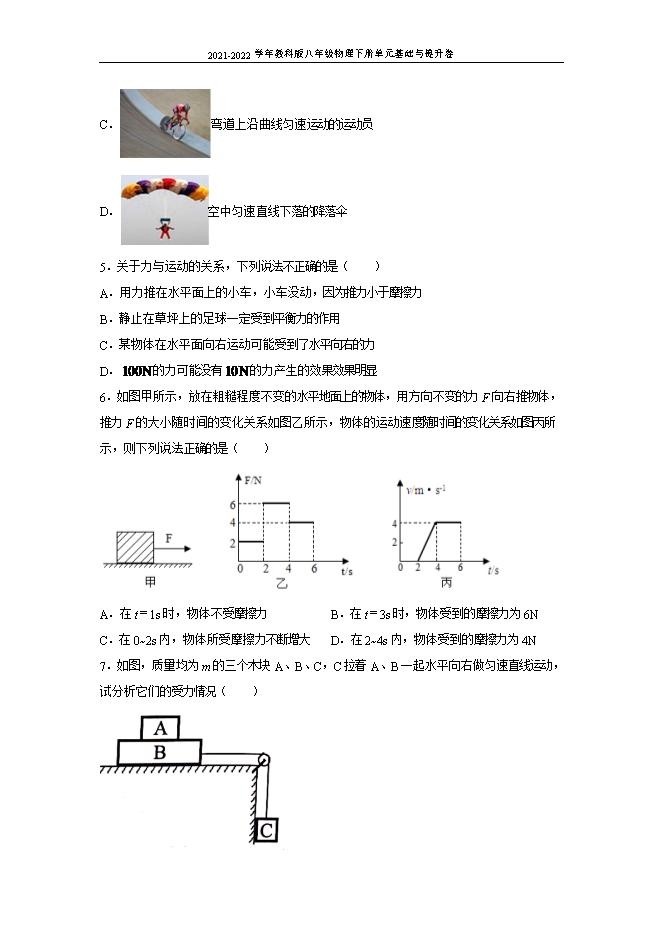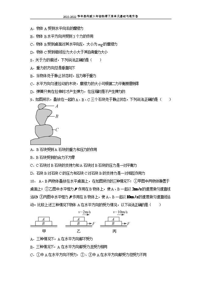 【内容简介】1.2020年7月2日是全国低碳日,骑车出行是“低碳生活”倡导方式之一。自行车上各部件,属于减小有害摩擦的是( )A.滚圆坚硬的钢珠B.花纹规则的轮胎 C.粗糙柔软的把手D.凸凹不平的脚踏2.如图所示,将弹簧测力计A、B的挂钩挂在一起,然后用手水平左右拉弹簧测力计的圆环,使其保持静止状态,当弹簧测力计A的示数为4N时,则弹簧测力计B的示数及右手对弹簧测力计B的拉力大小分别是( )A.8N、4NB.4N、8NC.0N、8ND.4N、4N3.关于力的概念,以下说法正确的是( )A.两个物体只要相互接触,就一定有力的作用B.力不能脱离物体而独立存在C.有力的作用就一定有施力物体,但可以没有受力物体D.两个相互不接触的物体之间,一定没有力的作用4.如下图所示,物体运动状态发生改变的是( )A. 吊在天花板下静止的电灯B. 路上匀速直线行驶的小汽车C. 弯道上沿曲线匀速运动的运动员D. 空中匀速直线下落的降落伞5.关于力与运动的关系,下列说法不正确的是( )A.用力推在水平面上的小车,小车没动,因为推力小于摩擦力B.静止在草坪上的足球一定受到平衡力的作用C.某物体在水平面向右运动可能受到了水平向右的力D. 的力可能没有 的力产生的效果效果明显6.如图甲所示,放在粗糙程度不变的水平地面上的物体,用方向不变的力F向右推物体,推力F的大小随时间的变化关系如图乙所示,物体的运动速度随时间的变化关系如图丙所示,则下列说法正确的是( ) A.在t=1s时,物体不受摩擦力B.在t=3s时,物体受到的摩擦力为6NC.在0~2s内,物体所受摩擦力不断增大D.在2~4s内,物体受到的摩擦力为4N7.如图,质量均为m的三个木块A、B、C,C拉着A、B一起水平向右做匀速直线运动,试分析它们的受力情况( ) A.物体A受到水平向右的摩擦力B.物体B水平方向共受到3个力的作用C.物体B受到桌面对其水平向左,大小为mg的摩擦力D.物体C受到细线拉力大小大于其自身重力大小8.关于力的描述,下列说法正确的是( )A.重力的方向总是垂直向下B.当物体处于静止状态时,压力等于重力C.水平方向匀速拉动的木块,摩擦力的大小可根据二力平衡原理测得D.弹簧只有在拉伸时才产生弹力,在压缩时是不产生弹力的9.如图所示,叠放在一起的A、B、C三个石块处于静止状态,下列说法正确的是( )