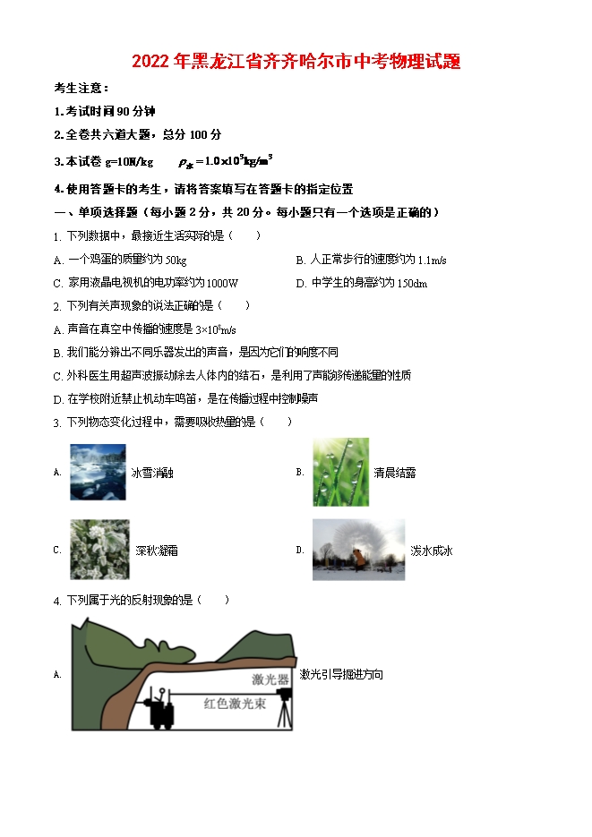 2022年黑龙江省齐齐哈尔市中考物理试题及答案(word版)