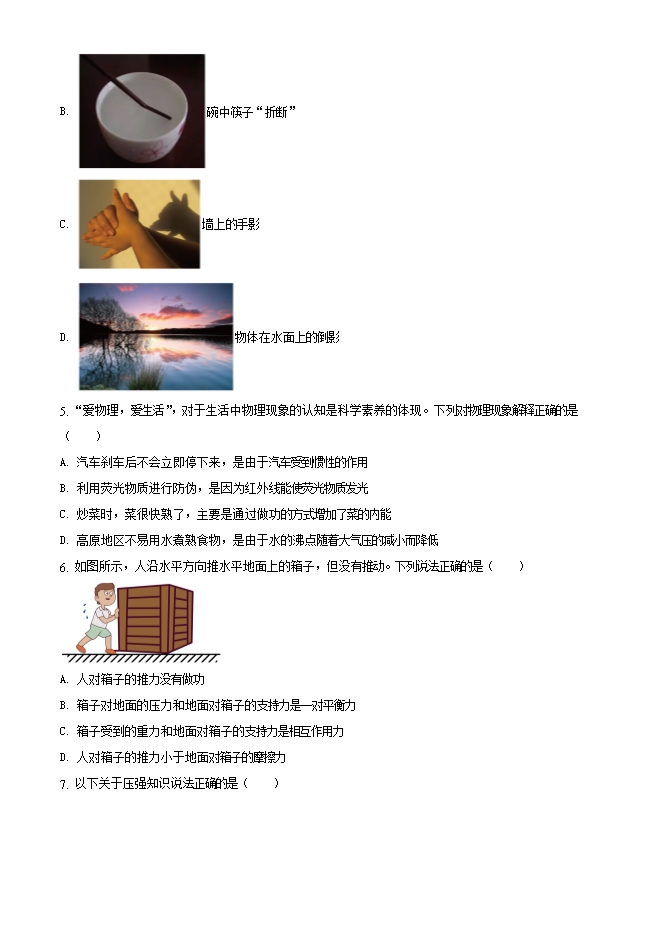 【内容简介】1. 下列数据中,最接近生活实际的是( )A. 一个鸡蛋的质量约为50kgB. 人正常步行的速度约为1.1m/sC. 家用液晶电视机的电功率约为1000WD. 中学生的身高约为150dm2. 下列有关声现象的说法正确的是( )A. 声音在真空中传播的速度是3×108m/sB. 我们能分辨出不同乐器发出的声音,是因为它们的响度不同C. 外科医生用超声波振动除去人体内的结石,是利用了声能够传递能量的性质D. 在学校附近禁止机动车鸣笛,是在传播过程中控制噪声3. 下列物态变化过程中,需要吸收热量的是( )A. 冰雪消融B. 清晨结露C. 深秋凝霜D. 泼水成冰4. 下列属于光的反射现象的是( )A. 激光引导掘进方向B. 碗中筷子“折断”C. 墙上的手影D. 物体在水面上的倒影5. “爱物理,爱生活”,对于生活中物理现象的认知是科学素养的体现。下列对物理现象解释正确的是( )A. 汽车刹车后不会立即停下来,是由于汽车受到惯性的作用B. 利用荧光物质进行防伪,是因为红外线能使荧光物质发光C. 炒菜时,菜很快熟了,主要是通过做功的方式增加了菜的内能D. 高原地区不易用水煮熟食物,是由于水的沸点随着大气压的减小而降低6. 如图所示,人沿水平方向推水平地面上的箱子,但没有推动。下列说法正确的是( )