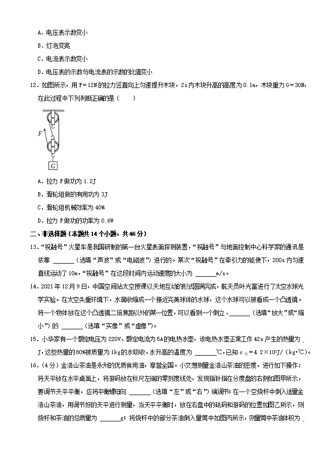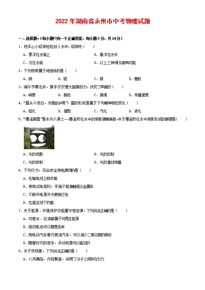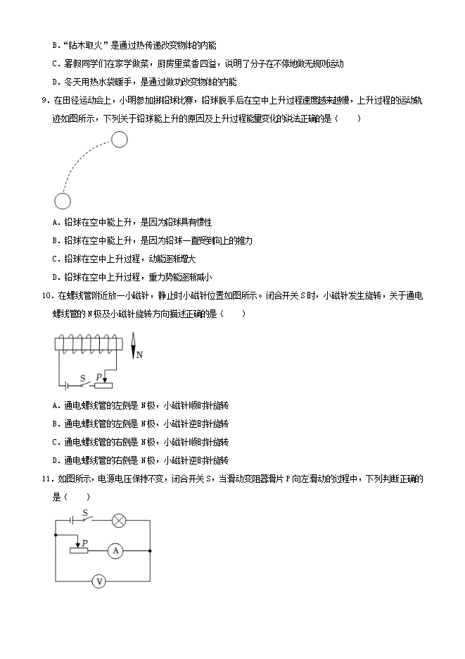 【内容简介】1.将实心小铅球轻轻放入水中,铅球将( )A.漂浮在水面上B.悬浮在水中C.沉在水底D.以上三种情况都有可能2.下列物质属于绝缘体的是( )A.铜B.铝C.银D.橡胶3.端午节赛龙舟,鼓手仅仅增大敲鼓的力,改变了声音的( )A.响度B.音色C.音调D.传播速度4.“露从今夜白,月是故乡明”,露的形成是属于下列哪种物态变化( )A.熔化B.凝固C.汽化D.液化5.“愚溪眺雪”是永州八景之一,愚溪桥在水中的倒影清晰美丽。关于愚溪桥在水中倒影形成的原理是( ) A.光的色散B.光的反射C.光的折射D.光的直线传播6.下列行为,符合安全用电原则的是( )A.在输电线上晾衣服B.使用试电笔时,手指不能接触笔尖金属体C.不断开电源开关更换灯泡D.在高压线下钓鱼7.关于能源、环境保护及能量守恒定律,下列说法正确的是( )A.可燃冰、石油都属于可再生能源B.废旧电池可以随意丢弃C.用电动汽车替代燃油汽车,可以减少二氧化碳的排放D.随着时代的进步,永动机是可以造出的8.关于热现象,下列说法正确的是( )A.八月蘋岛,丹桂飘香,说明了分子之间存在引力B.“钻木取火”是通过热传递改变物体的内能C.暑假同学们在家学做菜,厨房里菜香四溢,说明了分子在不停地做无规则运动D.冬天用热水袋暖手,是通过做功改变物体的内能9.在田径运动会上,小明参加掷铅球比赛,铅球脱手后在空中上升过程速度越来越慢,上升过程的运动轨迹如图所示,下列关于铅球能上升的原因及上升过程能量变化的说法正确的是( )