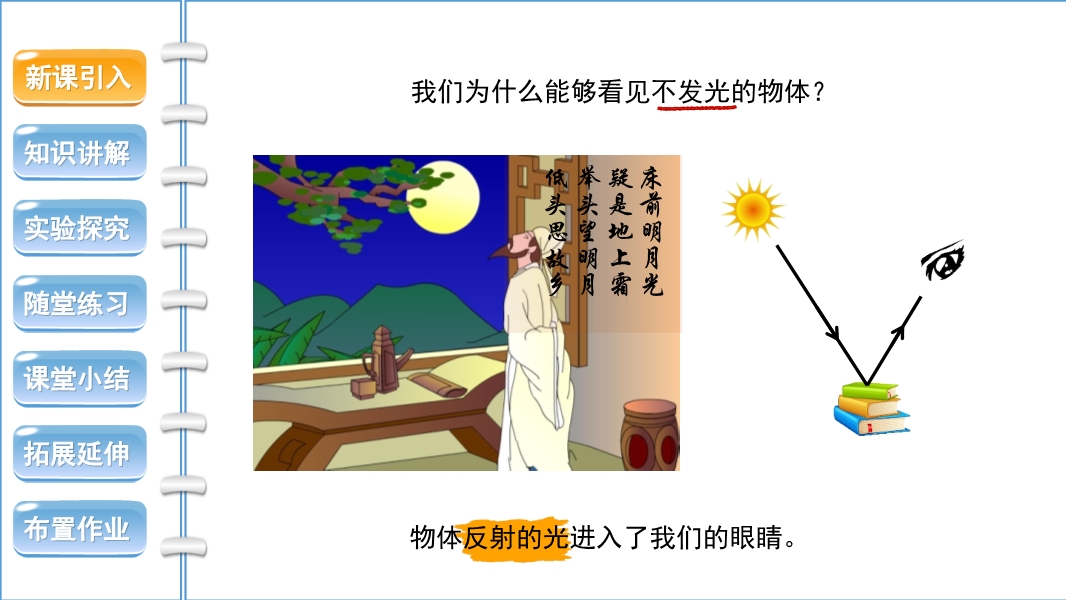 【内容简介】【ppt3】《静夜思》引入:提问:月亮不是光源,我们为什么能够看见它?讲解:我们能够看见不发光的物体,是物体反射的光进入了我们的眼睛。【ppt4】播放视频,引导学生观察光的反射现象。讲解:光射到两种介质的分界面时,被反射回原介质的现象。【ppt5、6】 提问:光反射时遵循什么规律呢?组织学生探究光反射时的规律:介绍实验器材、讲解实验步骤(注意事项)。学生实验,教师巡场,解决问题。【ppt7】播放视频,引导学生观察实验现象,归纳实验结论。