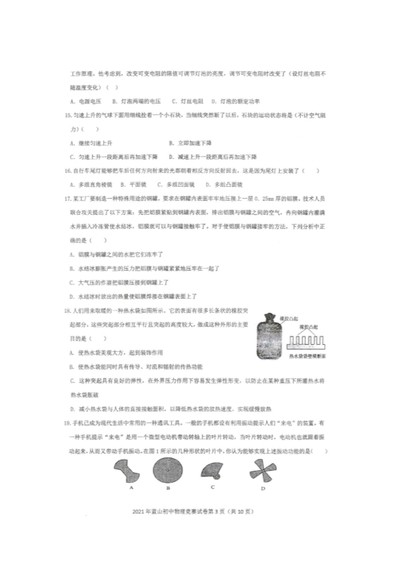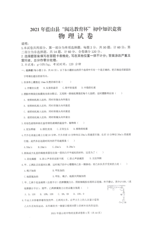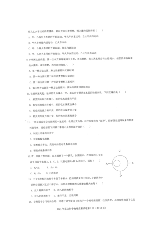 湖南省永州市蓝山县2021年“阅达教育杯”初中知识竞赛物理试题(pdf版无答案)