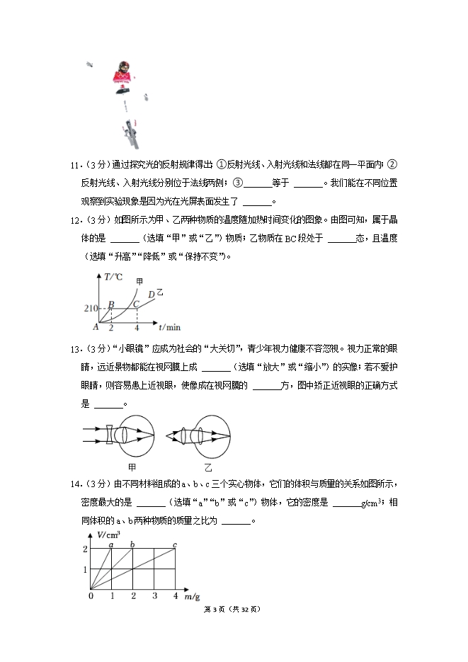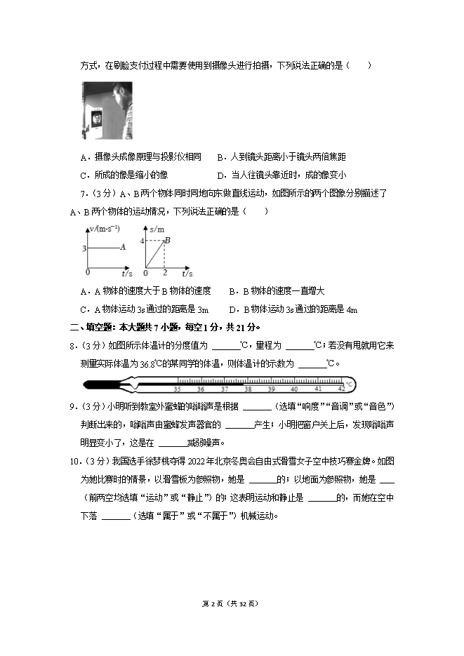 【内容简介】1.(3分)下列几种说法中,最符合实际情况的是( )A.教室门的高度约为220mmB.成人正常步行的速度约为10m/sC.某中学生的质量约为50g D.某矿泉水的密度为1.01×103kg/m32.(3分)“霜降”是中国传统的二十四节气之一,霜的形成属于( )A.凝固B.液化C.升华D.凝华3.(3分)下列选项中形容声音的“高”与其他三项不同的是( )A.引吭高歌B.高声喧哗C.男高音歌唱家D.广场的高音喇叭4.(3分)下列光现象与影子的形成原因相同的是( )A. 湖中倒影 B. 小孔成像C. 雨后彩虹 D. 弯折的筷子5.(3分)如图所示,将质量相等的盐水、水和酒精(ρ盐水>ρ水>ρ酒精)分别装入三个完全相同的烧杯中,则甲、乙、丙三个烧杯中分别装的是( ) A.盐水、水、酒精B.水、酒精、盐水C.盐水、酒精、水D.水、盐水、酒精6.(3分)刷脸支付是基于人工智能、机器视觉、3D传感、大数据等技术实现的新型支付方式,在刷脸支付过程中需要使用到摄像头进行拍摄,下列说法正确的是( ) A.摄像头成像原理与投影仪相同B.人到镜头距离小于镜头两倍焦距C.所成的像是缩小的像 D.当人往镜头靠近时,成的像变小7.(3分)A、B两个物体同时同地向东做直线运动,如图所示的两个图象分别描述了A、B两个物体的运动情况,下列说法正确的是( ) A.A物体的速度大于B物体的速度 B.B物体的速度一直增大C.A物体运动3s通过的距离是3m D.B物体运动3s通过的距离是4m二、填空题:本大题共7小题,每空1分,共21分。8.(3分)如图所示体温计的分度值为 ℃,量程为 ℃;若没有甩就用它来测量实际体温为36.8℃的某同学的体温,则体温计的示数为 ℃。
