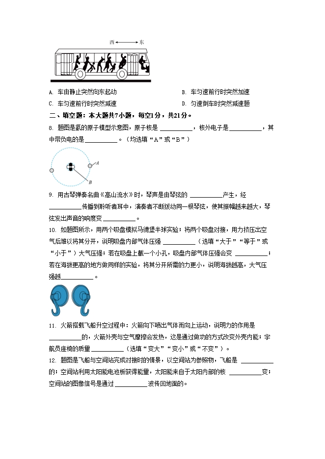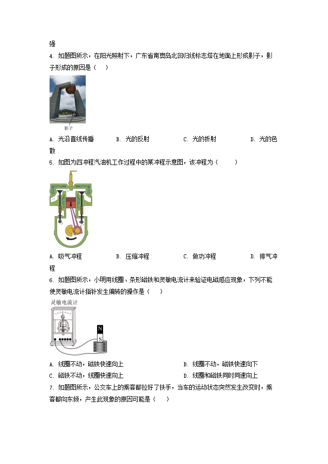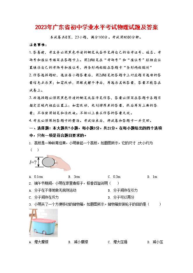 【内容简介】一、选择题:本大题共7小题,每小题3分,共21分。在每小题给出的四个选项中,只有一项是符合题目要求的。1. 荔枝是一种岭南佳果,小明拿起一个荔枝,如题图所示,它的尺寸l大小约为( ) A. 0.1cmB. 3cmC. 0.3mD. 1m2. 端午节期间,小明在家里煮粽子,粽香四溢说明( )A. 分子在不停地做无规则运动B. 分子间存在引力C. 分子间存在斥力D. 分子可以再分3. 小明买了一个方便移动的储物箱,如题图所示。储物箱安装轮子的目的是( ) A. 增大摩擦B. 减小摩擦C. 增大压强D. 减小压强4. 如题图所示,在阳光照射下,广东省南澳岛北回归线标志塔在地面上形成影子,影子形成的原因是( ) A. 光沿直线传播B. 光的反射C. 光的折射D. 光的色散5. 如图为四冲程汽油机工作过程中的某冲程示意图,该冲程为( ) A. 吸气冲程B. 压缩冲程C. 做功冲程D. 排气冲程6. 如题图所示,小明用线圈、条形磁铁和灵敏电流计来验证电磁感应现象,下列不能使灵敏电流计指针发生偏转的操作是( ) A. 线圈不动,磁铁快速向上B. 线圈不动,磁铁快速向下C. 磁铁不动,线圈快速向上D. 线圈和磁铁同时同速向上7. 如题图所示,公交车上的乘客都拉好了扶手,当车的运动状态突然发生改变时,乘客都向东倾,产生此现象的原因可能是( ) A. 车由静止突然向东起动B. 车匀速前行时突然加速C. 车匀速前行时突然减速D. 匀速倒车时突然减速题二、填空题:本大题共7小题,每空1分,共21分。8. 题图是氢的原子模型示意图,原子核是___________,核外电子是___________,其中带负电的是___________。(均选填“A”或“B”)