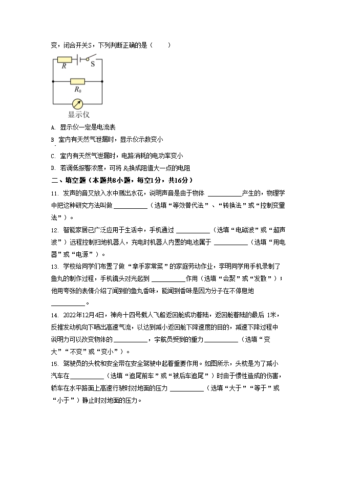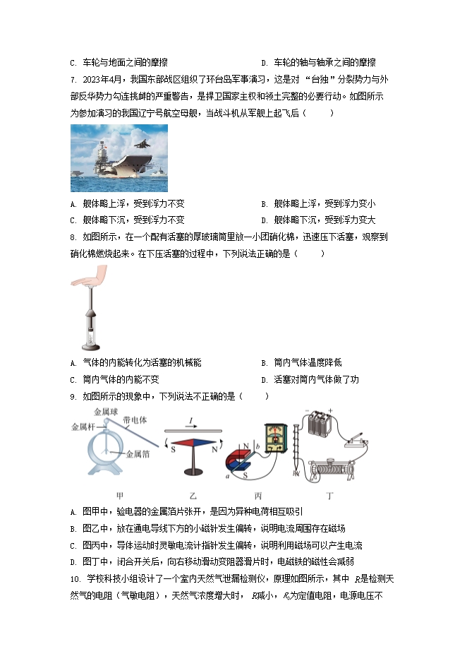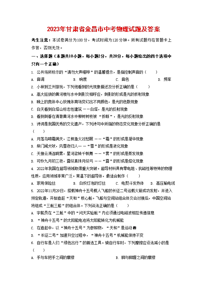 【内容简介】一、选择题(本题共10小题,每小题2分,共20分,每小题给出的四个选项中只有一个正确)1. 公共场所标示的“请勿大声喧哗”的温馨提示,是指控制声音的( )A. 音调B. 响度C. 音色D. 频率2. 小林到兰州游玩,下列他看到的光现象描述及分析正确的是( )A. 高大挺拔的黄河楼与水中倒影交相呼应,倒影的形成是光的折射现象B. 晚上的奥体中心玫瑰体育场变幻出不同颜色,是光的色散现象C. 白天看到白塔山标志性建筑——白塔,是光的反射现象D. 看到倒垂在清澈黄河水中柳树树枝被“折断”,是光的反射现象3. 诗词是我国优秀的文化遗产,下列诗句中所指的物态变化现象分析正确的是( )A. 月落乌啼霜满天,江枫渔火对愁眠——“霜”的形成是凝华现象B. 柴门闻犬吠,风雪夜归人一—“雪”的形成是液化现象C. 天接云涛连晓雾,星河欲转千帆舞——“雾”的形成是蒸发现象D. 可怜九月初三夜,露似真珠月似弓——“露”的形成是熔化现象4. 2022年我国在超导领域取得重大突破。超导材料具有零电阻、抗磁性等特殊的物理性质,应用领域非常广泛。常温下的超导体,最适合制作( )A. 家用保险丝B. 白炽灯泡的灯丝C. 电熨斗发热体D. 高压输电线5. 2022年11月29日,搭载神舟十五号载人飞船的长征二号运载火箭成功发射,并进入预定轨道,开始追赶“天和”核心舱。飞船与空间站组合体交会对接后,中国空间站将组成“三舱三船”的组合体。下列说法正确的是( )A. 宇航员在“三舱”中的“问天实验舱”内必须通过电磁波相互传递信息B. “神舟十五号”的太阳能电池将太阳能转化为机械能C. 在追赶中,以“神舟十五号”为参照物,“天和”是运动 D. “长征二号”加速升空过程中,“神舟十五号”机械能保持不变6. 自行车是人们“绿色出行”的首选工具。骑自行车时,下列摩擦应设法减小的是( )A. 手与车把手之间的摩擦B. 脚与脚蹬之间的摩擦C. 车轮与地面之间的摩擦D. 车轮的轴与轴承之间的摩擦7. 2023年4月,我国东部战区组织了环台岛军事演习,这是对“台独”分裂势力与外部反华势力勾连挑衅的严重警告,是捍卫国家主权和领土完整的必要行动。如图所示为参加演习的我国辽宁号航空母舰,当战斗机从军舰上起飞后( )