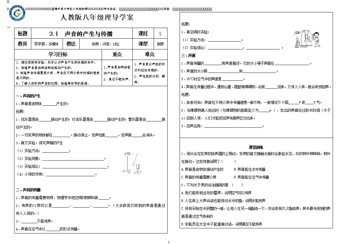 盘锦市育才学校八年级上学期物理导学案:2.1 声音的产生与传播