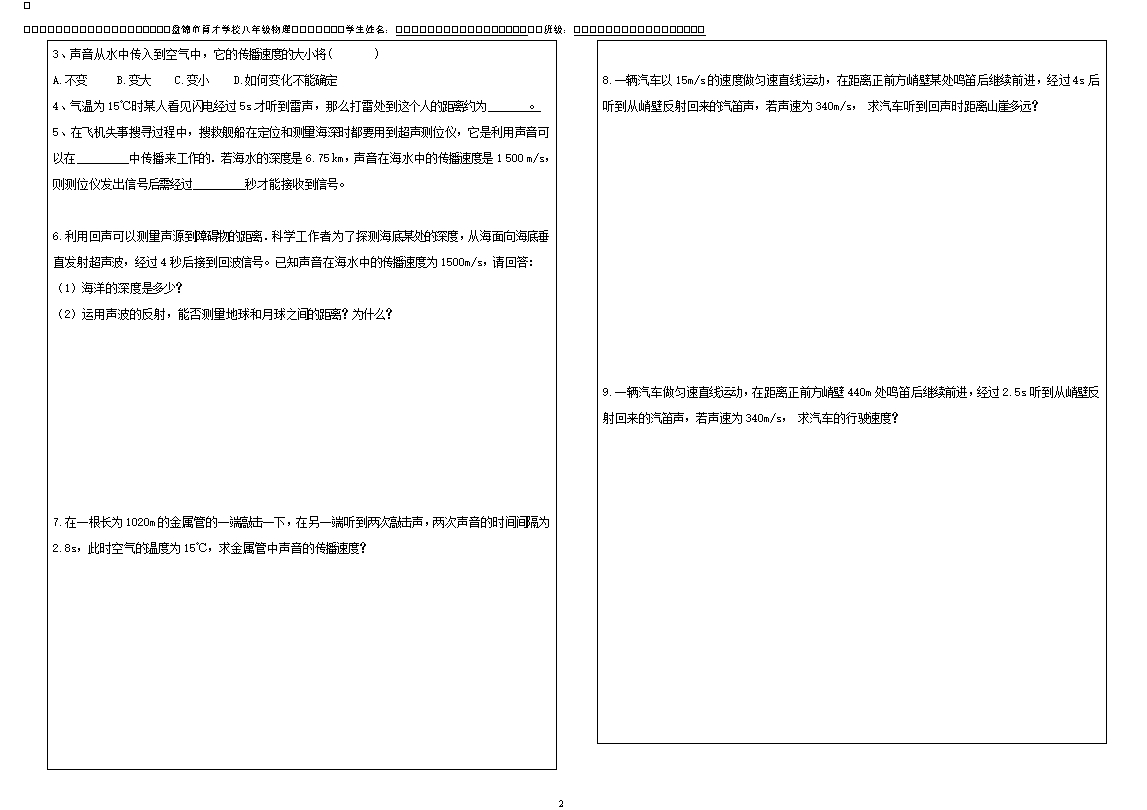 【内容简介】一、声音的产生1、声音是由物体 产生的。拓展:1、弦乐器是由 振动产生的,打击乐器是由 振动产生的,管乐器是由 振动产生的。1、一切发声的物体都在 。振动停止,发声也就 。但声音 会消失。2、音叉实验:探究声音的产生(1)实验方法: 。(2)实验现象: 。(3)实验结论: 。(4)小球的作用: 。二、声音的传播1、声音的传播需要物质,物理学中把这样的物质叫做 。2、传声的介质可以是 、 、 。(大多数我们听到的声音是通过 传入人耳的。)3、 不能传声。4、声音在空气中以 的形式传播。拓展:1、真空闹铃实验:(1)实验方法: 。(2)实验结论: , 。三、声速1、声音传播的 用声速描述。它的大小等于声音在 。2、声速的大小跟 和 。3、15℃时空气中的声速是 。4、声音在传播过程中,遇到山崖、墙壁等障碍物,会被 回来,又传入人耳,就会听到回声。拓展:1、由表可知:声音在不同介质中传播速度一般不同,一般情况下V固 V液 V气。2、当障碍物离人较远时(与障碍物的距离至少为 m ),发出的声音经过较长时间(大于 s)回到人耳,人们才能把回声和原声区分出来。3、回声应用: 。