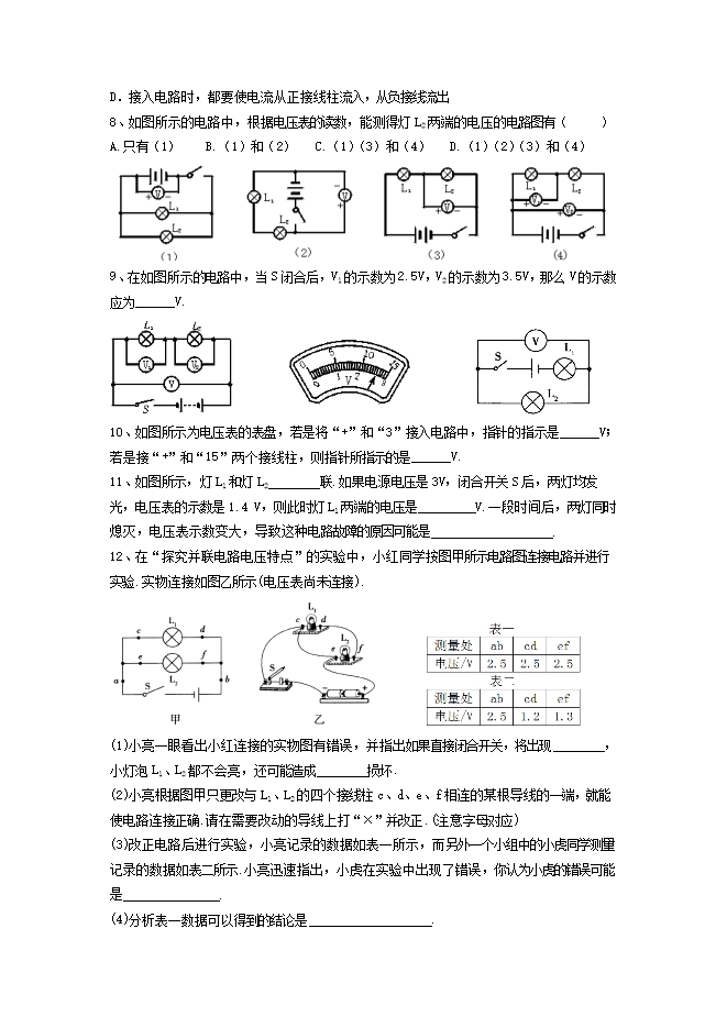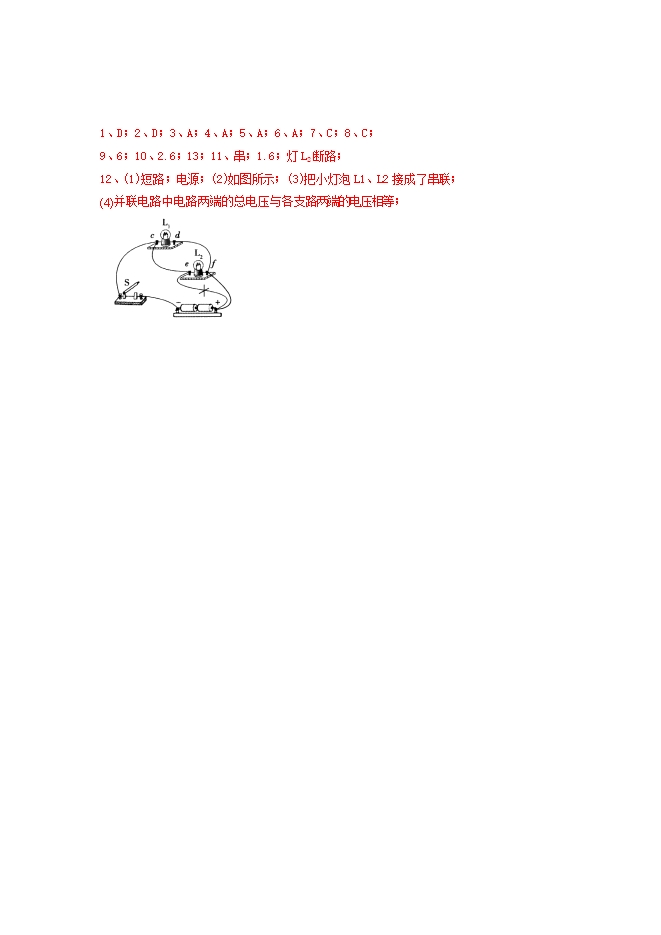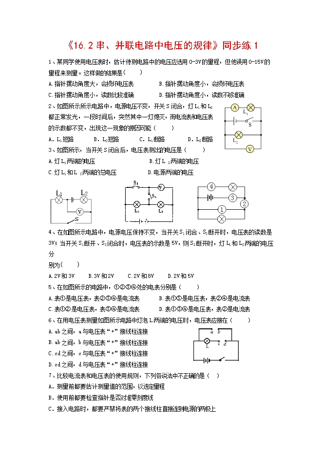 【内容简介】1、某同学使用电压表时,估计待测电路中的电压应选用0-3V的量程,但他误用0-15V的量程来测量。这样做的结果是( )A.指针摆动角度大,会损坏电压表 B.指针摆动角度小,会损坏电压表C.指针摆动角度小,读数比较准确 D.指针摆动角度小,读数不够准确2、如图所示所示电路中,电源电压不变,开关S闭合,灯L1和L2都正常发光,一段时间后,突然其中一灯熄灭,而电流表和电压表的示数都不变,出现这一现象的原因可能( )A.L1短路 B.L2短路 C.L1断路 D.L2断路3、如图所示,当开关S闭合后,电压表测出的电压是( )A.灯L1两端的电压 B.灯L 2两端的电压C.灯L1和L 2两端的总电压 D.电源两端的电压