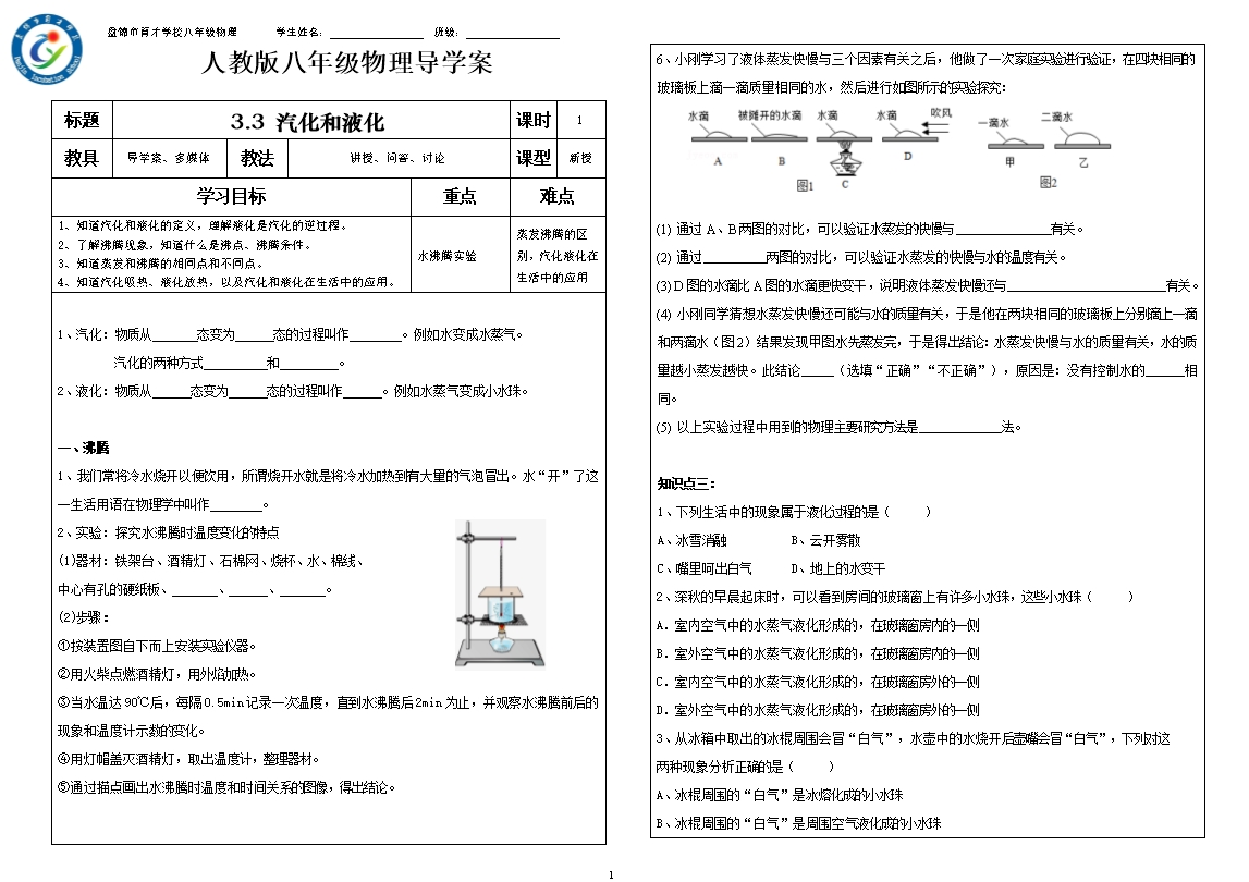 盘锦市育才学校八年级上学期物理导学案:3.3 汽化和液化