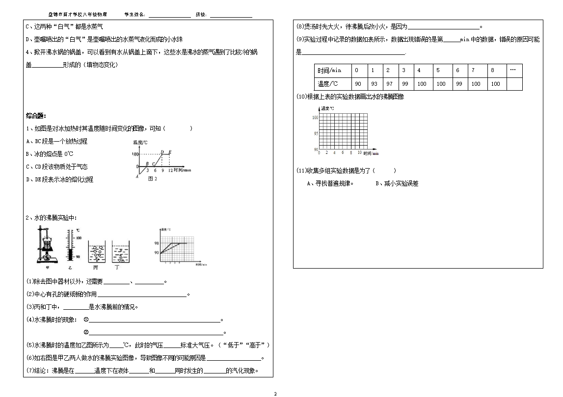 【内容简介】1、汽化:物质从 态变为 态的过程叫作 。例如水变成水蒸气。 汽化的两种方式 和 。2、液化:物质从 态变为 态的过程叫作 。例如水蒸气变成小水珠。一、沸腾1、我们常将冷水烧开以便饮用,所谓烧开水就是将冷水加热到有大量的气泡冒出。水“开”了这一生活用语在物理学中叫作 。2、实验:探究水沸腾时温度变化的特点(1)器材:铁架台、酒精灯、石棉网、烧杯、水、棉线、中心有孔的硬纸板、 、 、 。(2)步骤:①按装置图自下而上安装实验仪器。 ②用火柴点燃酒精灯,用外焰加热。③当水温达90℃后,每隔0.5min记录一次温度,直到水沸腾后2min为止,并观察水沸腾前后的现象和温度计示数的变化。④用灯帽盖灭酒精灯,取出温度计,整理器材。