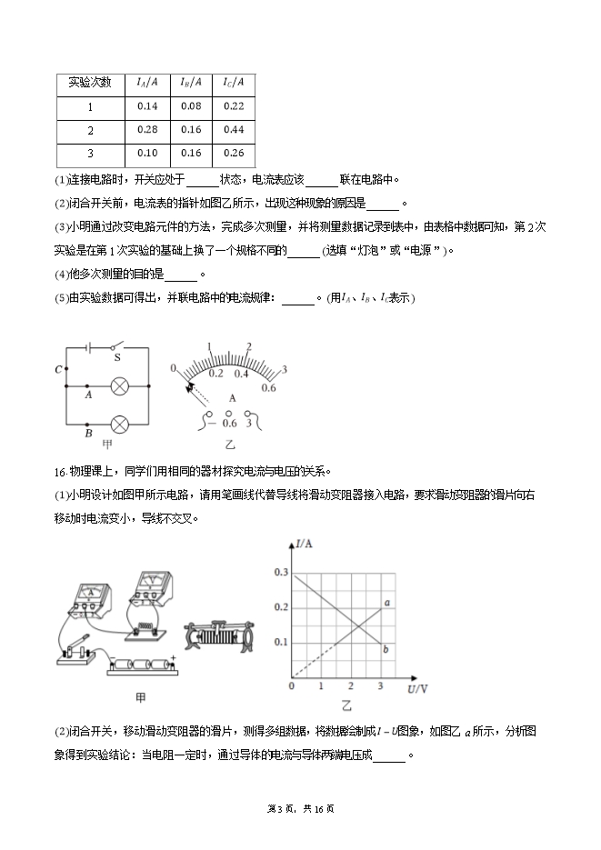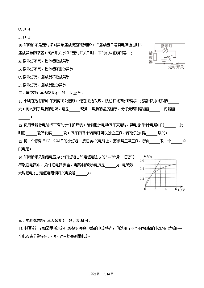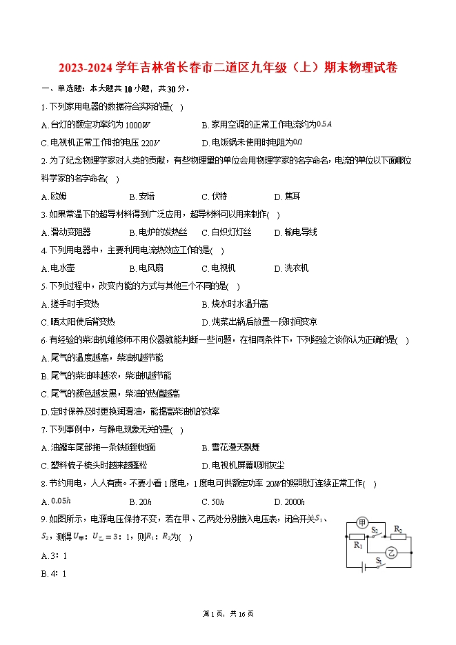 【内容简介】1.下列家用电器的数据符合实际的是( )A. 台灯的额定功率约为1000W B. 家用空调的正常工作电流约为0.5AC. 电视机正常工作时的电压220V D. 电饭锅未使用时电阻为0Ω2.为了纪念物理学家对人类的贡献,有些物理量的单位会用物理学家的名字命名,电流的单位以下面哪位科学家的名字命名( )A. 欧姆 B. 安培 C. 伏特 D. 焦耳3.如果常温下的超导材料得到广泛应用,超导材料可以用来制作( )A. 滑动变阻器 B. 电炉的发热丝 C. 白炽灯灯丝 D. 输电导线4.下列用电器中,主要利用电流热效应工作的是( )A. 电水壶 B. 电风扇 C. 电视机 D. 洗衣机5.下列过程中,改变内能的方式与其他三个不同的是( )A. 搓手时手变热 B. 烧水时水温升高C. 晒太阳使后背变热 D. 炖菜出锅后放置一段时间变凉6.有经验的柴油机维修师不用仪器就能判断一些问题,在相同条件下,下列经验之谈你认为正确的是( )A. 尾气的温度越高,柴油机越节能B. 尾气的柴油味越浓,柴油机越节能C. 尾气的颜色越发黑,柴油的热值越高D. 定时保养及时更换润滑油,能提高柴油机的效率7.下列事例中,与静电现象无关的是( )A. 油罐车尾部拖一条铁链到地面 B. 雪花漫天飘舞C. 塑料梳子梳头时越来越蓬松 D. 电视机屏幕吸附灰尘