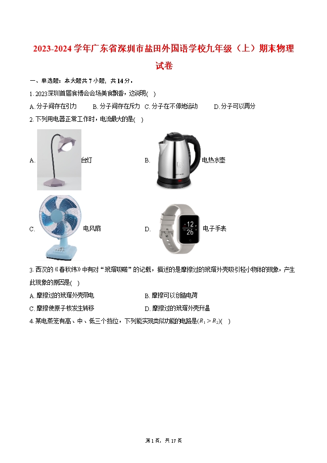 【内容简介】1.2023深圳首届食博会会场美食飘香,这说明( )A. 分子间存在引力 B. 分子间存在斥力 C. 分子在不停地运动 D. 分子可以再分2.下列用电器正常工作时,电流最大的是( )A. 台灯 B. 电热水壶C. 电风扇 D. 电子手表3.西汉的《春秋纬》中有对“玳瑁吸喏”的记载,描述的是摩擦过的玳瑁外壳吸引轻小物体的现象,产生此现象的原因是( )A. 摩擦过的玳瑁外壳带电 B. 摩擦可以创造电荷C. 摩擦使原子核发生转移 D. 摩擦过的玳瑁外壳升温4.某电蒸笼有高、中、低三个挡位,下列能实现类似功能的电路是(R1>R2)( )A. B. C. D. 5.如图所示,闭合开关后,发现白炽灯泡L1比L2亮,则( )A. 通过L1的电流较小B. L_2的电阻较大C. L_2两端电压较小D. 若将L1与L2调换,L2更亮6.如图所示,电源电压恒定不变,电阻R1和R2分别浸没在等量红色热消失液体中(温度越高,液体颜色越浅)。通电1min,R2的颜色比R1浅,下列说法正确的是( )7.实验表明,物质的比热容会随温度的变化而变化。如图为铝的比热容随温度变化的图像,下列判断正确的是( )