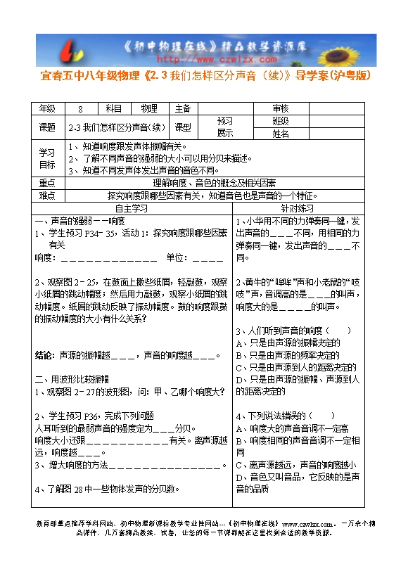 宜春五中八年级物理《2.3我们怎样区分声音(续)》导学案(沪粤版)