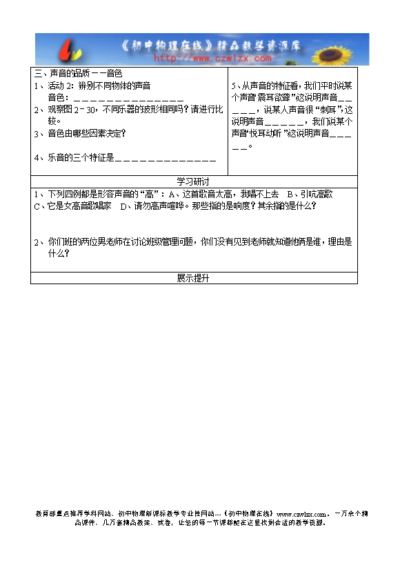 课题 2.3我们怎样区分声音(续) 课型 预习展示