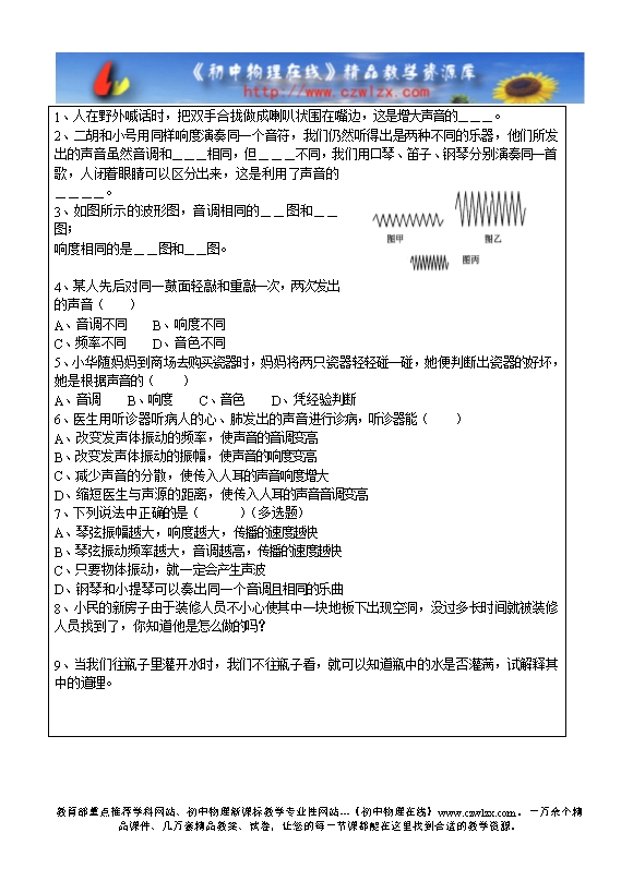 一、 声音的强弱——响度1、 学生预习P34-35,活动1:探究响度跟哪些因素有关响度:____________ 单位:____2、观察图2-25,在鼓面上撒些纸屑,轻敲鼓,观察小纸屑的跳动幅度;然后用力敲鼓,观察小纸屑的跳动幅度。纸屑的跳动反映了振动幅度。鼓的响度跟鼓的振动幅度的大小有什么关系?结论:声源的振幅越___,声音的响度越___。二、 用波形比较振幅1、观察图2-27的波形图,问:甲、乙哪个响度大?2、 学生预习P36,完成下列问题人耳听到的最弱声音的强度定为___分贝。响度大小还跟__________有关。离声源越远,响度越___。3、 增大响度的方法______________。4、了解图28中一些物体发声的分贝数。三、 声音的品质——音色1、 活动2:辨别不同物体的声音音色:______________2、 观察图2-30,不同乐器的波形相同吗?请进行比较。3、 音色由哪些因素决定?4、 乐音的三个特征是_____________