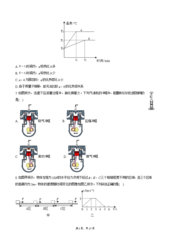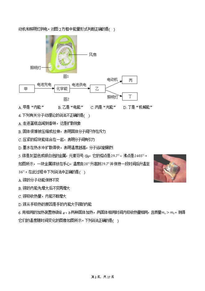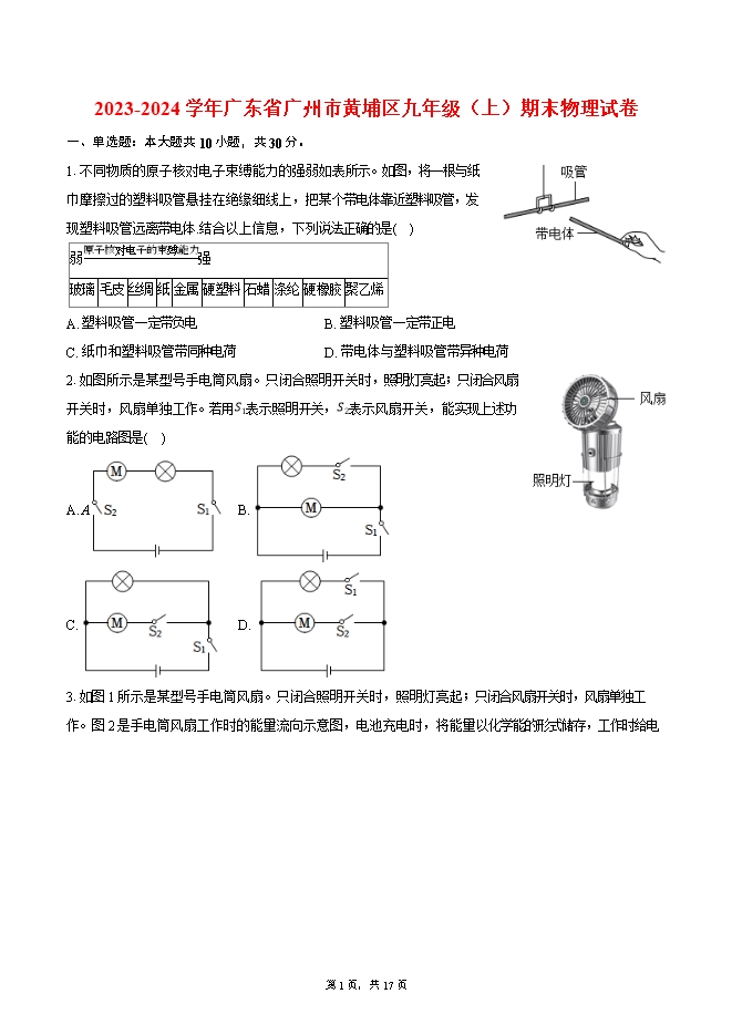 【内容简介】1.不同物质的原子核对电子束缚能力的强弱如表所示。如图,将一根与纸巾摩擦过的塑料吸管悬挂在绝缘细线上,把某个带电体靠近塑料吸管,发现塑料吸管远离带电体.结合以上信息,下列说法正确的是( )弱原子核对电子的束缚能力/强玻璃 毛皮 丝绸 纸 金属 硬塑料 石蜡 涤纶 硬橡胶 聚乙烯A. 塑料吸管一定带负电 B. 塑料吸管一定带正电C. 纸巾和塑料吸管带同种电荷 D. 带电体与塑料吸管带异种电荷2.如图所示是某型号手电筒风扇。只闭合照明开关时,照明灯亮起;只闭合风扇开关时,风扇单独工作。若用S_1表示照明开关,S_2表示风扇开关,能实现上述功能的电路图是( )A. A B. C. D. 3.如图1所示是某型号手电筒风扇。只闭合照明开关时,照明灯亮起;只闭合风扇开关时,风扇单独工作。图2是手电筒风扇工作时的能量流向示意图,电池充电时,将能量以化学能的形式储存,工作时给电动机和照明灯供电。对图2方框中能量形式判断正确的是( ) A. 甲是“内能” B. 乙是“电能” C. 丙是“光能” D. 丁是“机械能”4.下列有关分子动理论的说法不正确的是( )A. 走进蛋糕店闻到香味,这是扩散现象B. 固体很难被压缩或拉伸,表明固体分子间只存在斥力C. 压紧的铅块能结合在一起,表明分子间有引力D. 墨水在热水中扩散得快,表明温度越高,分子运动越剧烈