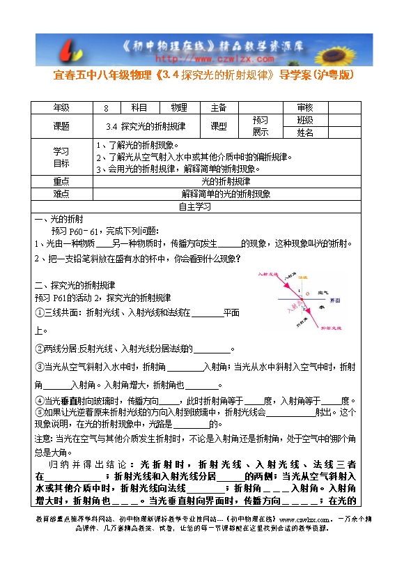 宜春五中八年级物理《3.4探究光的折射规律》导学案(沪粤版)