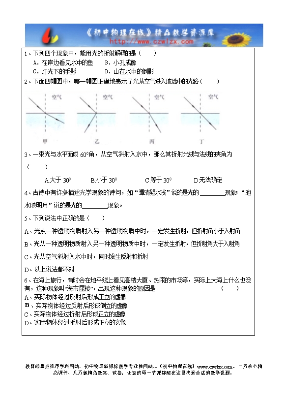 一、 光的折射预习P60-61,完成下列问题:1、光由一种物质 另一种物质时,传播方向发生 的现象,这种现象叫光的折射。2、把一支铅笔斜放在盛有水的杯中,你会看到什么现象?二、 探究光的折射规律预习P61的活动2,探究光的折射规律①三线共面:折射光线、入射光线和法线在 平面上。 ②两线分居:反射光线、入射光线分居法线的 。③当光从空气斜射入水中时,折射角 入射角;当光从水中斜射入空气中时,折射角 入射角。入射角增大,折射角也 。 ④当光垂直射向玻璃时,传播方向 ,此时折射角等于 度,入射角等于 度。