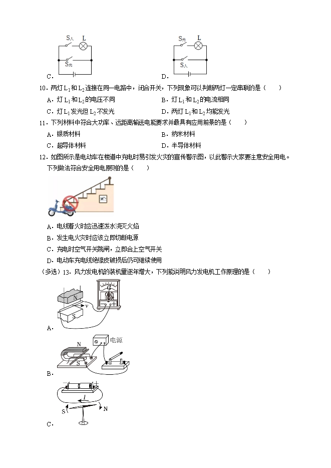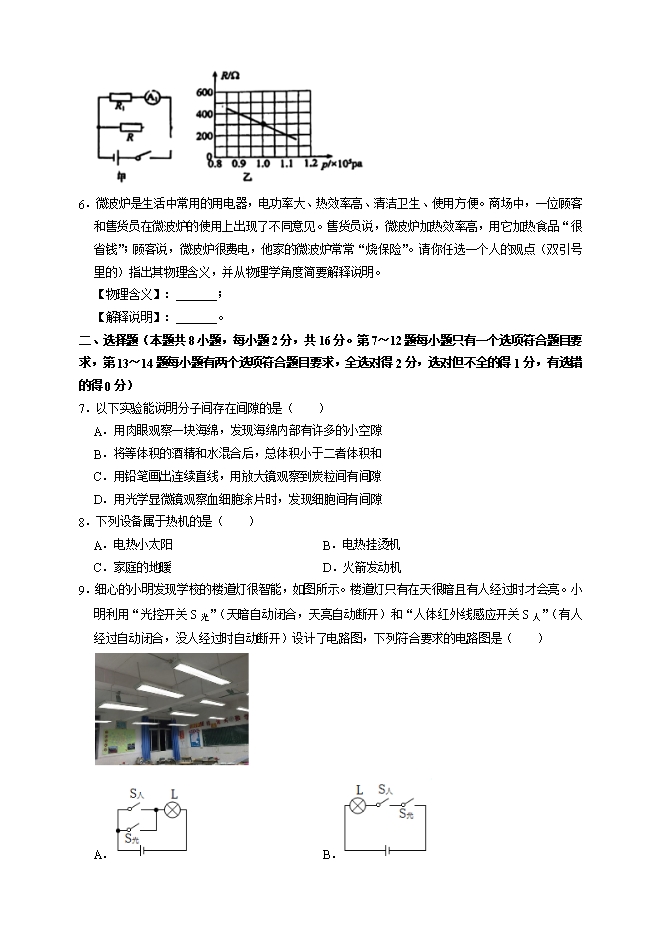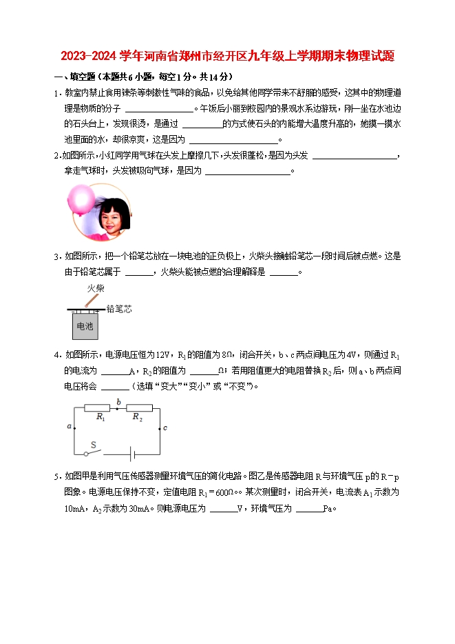 【内容简介】1.教室内禁止食用辣条等刺激性气味的食品,以免给其他同学带来不舒服的感受,这其中的物理道理是物质的分子 。午饭后小丽到校园内的景观水系边游玩,刚一坐在水池边的石头台上,发现很烫,是通过 的方式使石头的内能增大温度升高的,她摸一摸水池里面的水,却很凉爽,这是因为 。2.如图所示,小红同学用气球在头发上摩擦几下,头发很蓬松,是因为头发 ,拿走气球时,头发被吸向气球,是因为 。 3.如图所示,把一个铅笔芯放在一块电池的正负极上,火柴头接触铅笔芯一段时间后被点燃。这是由于铅笔芯属于 ,火柴头能被点燃的合理解释是 。 4.如图所示,电源电压恒为12V,R1的阻值为8Ω,闭合开关,b、c两点间电压为4V,则通过R1的电流为 A,R2的阻值为 Ω;若用阻值更大的电阻替换R2后,则a、b两点间电压将会 (选填“变大”“变小”或“不变”)。 5.如图甲是利用气压传感器测量环境气压的简化电路。图乙是传感器电阻R与环境气压p的R﹣p图象。电源电压保持不变,定值电阻R1=600Ω。。某次测量时,闭合开关,电流表A1示数为10mA,A2示数为30mA。则电源电压为 V,环境气压为 Pa。 6.微波炉是生活中常用的用电器,电功率大、热效率高、清洁卫生、使用方便。商场中,一位顾客和售货员在微波炉的使用上出现了不同意见。售货员说,微波炉加热效率高,用它加热食品“很省钱”;顾客说,微波炉很费电,他家的微波炉常常“烧保险”。请你任选一个人的观点(双引号里的)指出其物理含义,并从物理学角度简要解释说明。【物理含义】: ;【解释说明】: 。二、选择题(本题共8小题,每小题2分,共16分。第7~12题每小题只有一个选项符合题目要求,第13~14题每小题有两个选项符合题目要求,全选对得2分,选对但不全的得1分,有选错的得0分)7.以下实验能说明分子间存在间隙的是( )A.用肉眼观察一块海绵,发现海绵内部有许多的小空隙 B.将等体积的酒精和水混合后,总体积小于二者体积和 C.用铅笔画出连续直线,用放大镜观察到炭粒间有间隙 D.用光学显微镜观察血细胞涂片时,发现细胞间有间隙