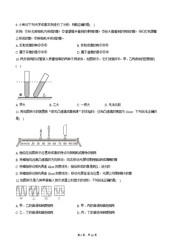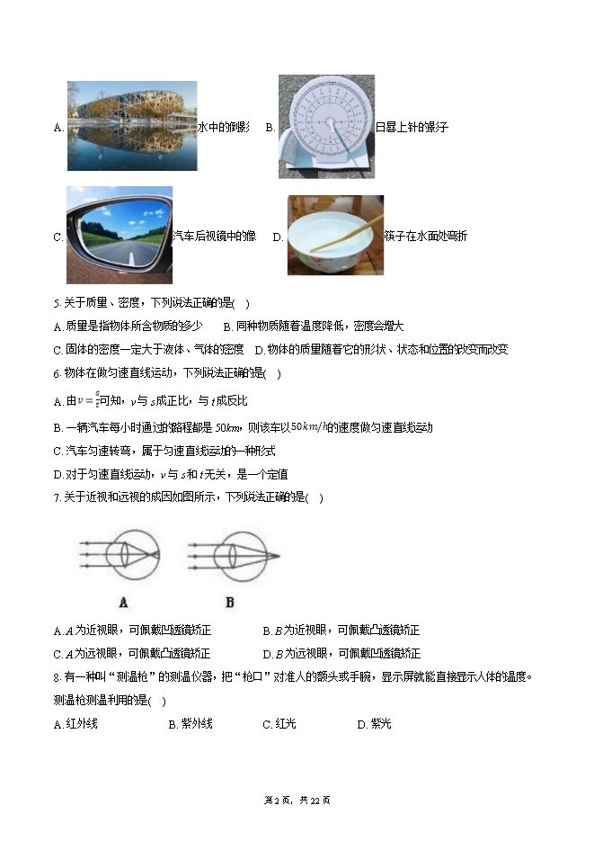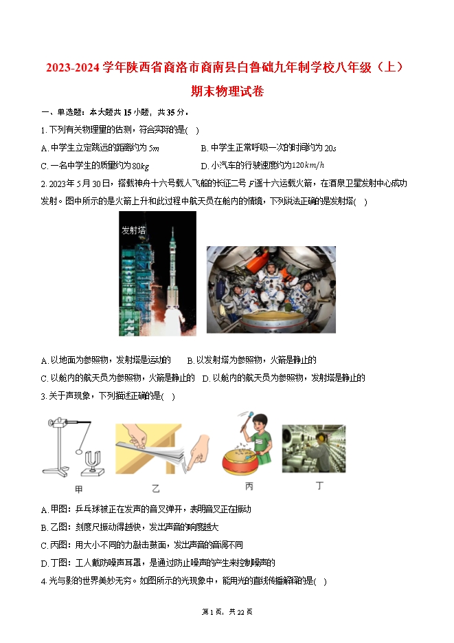 【内容简介】1.下列有关物理量的估测,符合实际的是( )A. 中学生立定跳远的距离约为5m B. 中学生正常呼吸一次的时间约为20sC. 一名中学生的质量约为80kg D. 小汽车的行驶速度约为120km/h2.2023年5月30日,搭载神舟十六号载人飞船的长征二号F遥十六运载火箭,在酒泉卫星发射中心成功发射。图中所示的是火箭上升和此过程中航天员在舱内的情境,下列说法正确的是发射塔( )A. 以地面为参照物,发射塔是运动的 B. 以发射塔为参照物,火箭是静止的C. 以舱内的航天员为参照物,火箭是静止的 D. 以舱内的航天员为参照物,发射塔是静止的3.关于声现象,下列描述正确的是( )A. 甲图:乒乓球被正在发声的音叉弹开,表明音叉正在振动B. 乙图:刻度尺振动得越快,发出声音的响度越大C. 丙图:用大小不同的力敲击鼓面,发出声音的音调不同D. 丁图:工人戴防噪声耳罩,是通过防止噪声的产生来控制噪声的4.光与影的世界美妙无穷。如图所示的光现象中,能用光的直线传播解释的是( )A. 水中的倒影 B. 日晷上针的影子C. 汽车后视镜中的像 D. 筷子在水面处弯折5.关于质量、密度,下列说法正确的是( )A. 质量是指物体所含物质的多少 B. 同种物质随着温度降低,密度会增大C. 固体的密度一定大于液体、气体的密度 D. 物体的质量随着它的形状、状态和位置的改变而改变6.物体在做匀速直线运动,下列说法正确的是( )A. 由v=s/t可知,v与s成正比,与t成反比B. 一辆汽车每小时通过的路程都是50km,则该车以50km/h的速度做匀速直线运动C. 汽车匀速转弯,属于匀速直线运动的一种形式