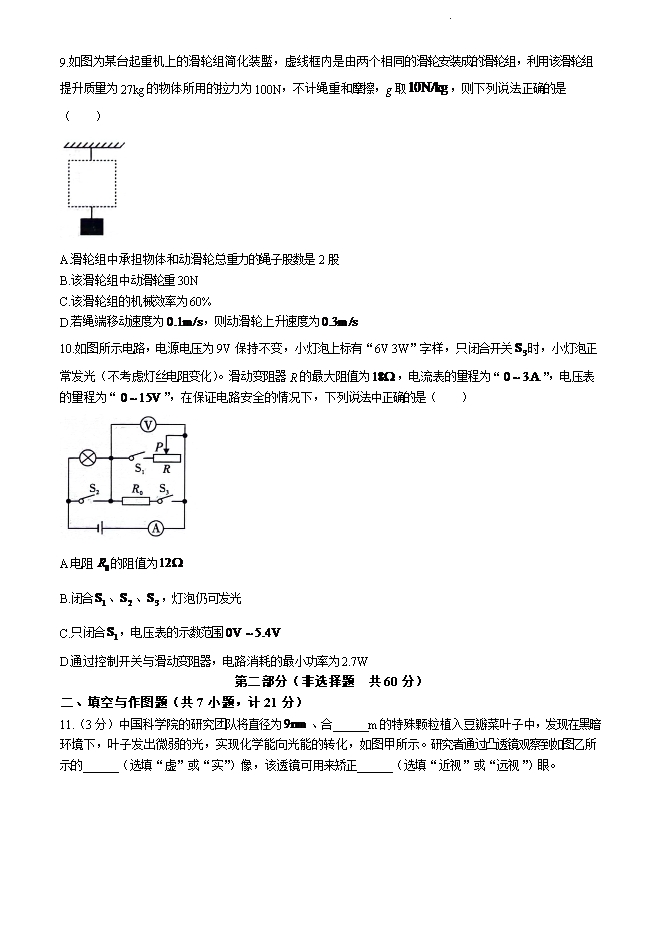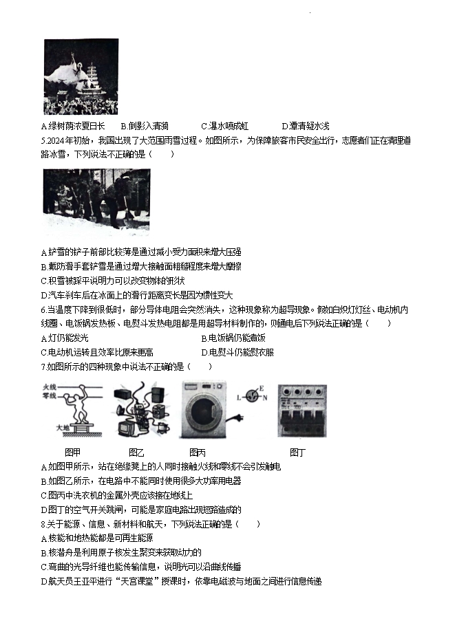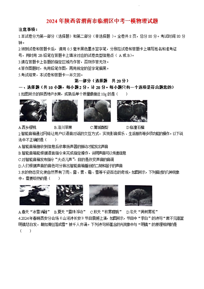 【内容简介】注意事项:1.本试卷分为第一部分(选择题)和第二部分(非选择题)。全卷共8页,总分80分。考试时间80分钟。2.领到试卷和答题卡后,请用0.5毫米黑色墨水签字笔,分别在试卷和答题卡上填写姓名和准考证号,同时用2B铅笔在答题卡上填涂对应的试卷类型信息点(A或B)。3.请在答题卡上各题的指定区域内作答,否则作答无效。4.答作图题时,先用铅笔作图,再用规定的签字笔描黑。5.考试结束,本试卷和答题卡一并交回。第一部分(选择题 共20分)一、选择题(共10小题,每小题2分,计20分。每小题只有一个选项是符合题意的)1.如图所示的陕西特产水果,成熟后单个质量最接近10g的是( ) A.西乡樱桃 B.洛川苹果 C.蒲城酥梨 D.临潼石榴2.智能音箱通过网络让用户以语音对话的交互方式,实现影音娱乐、生活服务等多项功能的操作。以下说法中不正确的是( )A.智能音箱接收到信息后依靠扬声器的振动才能发出声音B.智能音箱能根据语言指令来完成指定操作,说明声音可以传递信息C.对智能音箱发布指令“大点儿声”,目的是改变声音的音调D.人们根据声音的音色可分辨出智能音箱播放的二胡和笛子的声音3.水的物态变化使自然界有了雨、露、雾、霜、雪等千姿百态的奇观。如图所示,下列描述的几种现象中,需要吸热的是( )A.春天“冰雪消融” B.夏天“露珠浮动” C.秋天“秋雾朦胧” D.冬天“满树雾淞”4.2024年春晚西安分会场《山河诗长安》节目震撼上演,如图所示,节目中“李白”的诗句“君不见高堂明镜悲白发,朝如青丝落成雪”被千人齐诵。下列诗句所蕴含的光现象中与“明镜”的原理相同的是( )A.绿树荫浓夏日长 B.倒影入清漪 C.瀑水喷成虹 D.潭清疑水浅5.2024年初始,我国出现了大范围雨雪过程。如图所示,为保障旅客市民安全出行,志愿者们正在清理道路冰雪,下列说法不正确的是( )A.铲雪的铲子前部比较薄是通过减小受力面积来增大压强B.戴防滑手套铲雪是通过增大接触面粗糙程度来增大摩擦C.积雪被踩平说明力可以改变物体的形状D.汽车刹车后在冰面上的滑行距离变长是因为惯性变大6.当温度下降到很低时,部分导体电阻会突然消失,这种现象称为超导现象。假如白炽灯灯丝、电动机内线圈、电饭锅发热板、电熨斗发热电阻都是用超导材料制作的,则通电后下列说法正确的是( )A.灯仍能发光 B.电饭锅仍能煮饭C.电动机运转且效率比原来更高 D.电熨斗仍能熨衣服7.如图所示的四种现象中说法不正确的是( )