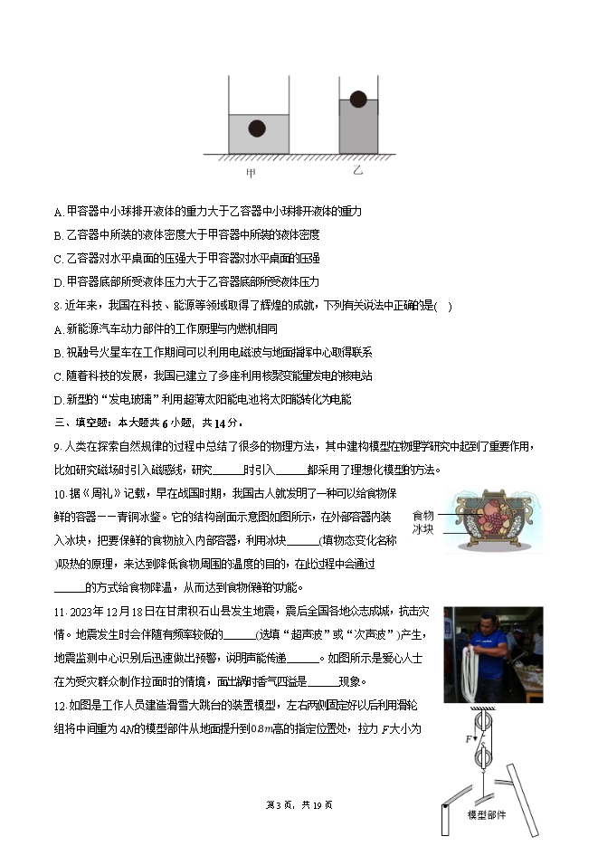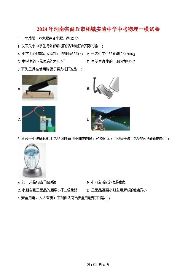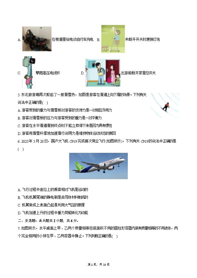 【内容简介】1.以下关于中学生身体的数据的估测最符合实际的是( )A. 中学生心脏跳动60次所用的时间约为6s B. 一名中学生的质量约为500kgC. 中学生的正常体温约为〖36.5〗^℃ D. 中学生身体的电阻约为0.19Ω2.下列工具在使用时属于费力杠杆的是( )A. B. C. D. 3.透过一个玻璃球形工艺品可以看到小朋友的像,如图所示。下列关于该工艺品的说法正确的是( ) A. 该工艺品相当于凹透镜 B. 小朋友所成的像是虚像C. 小朋友到工艺品的距离小于二倍焦距 D. 工艺品远离小朋友后所成的像会变小4.安全用电,人人有责。下列做法符合安全用电要求的是( )A. 在楼道里给电动自行车充电 B. 未断开开关时更换灯泡C. 攀爬高压电线杆 D. 出游前断开家里总开关5.东北旅游潮再次掀起了一股滑雪热,如图是游客在滑道上向下滑的场景。下列有关说法中正确的是( )A. 游客受到的重力与滑雪板对游客的支持力是一对相互作用力B. 游客对滑雪板的压力与游客受到的重力是一对平衡力C. 游客在水平滑道滑到终点时不能立即停下来是因为具有惯性D. 游客用滑雪杆撑地加速滑行说明力是维持物体运动状态的原因6.2023年5月28日,国产大飞机C919完成首次商业飞行(如图所示),下列有关C919的说法中正确的是( )A. 飞行过程中座位上的乘客相对飞机是运动的B. 飞机机翼尾端的静电刷是由导体材料制成的C. 机翼做成上表面凸起是利用大气压的原理D. 飞机加速上升的过程中重力势能转化为动能二、多选题:本大题共2小题,共4分。7.如图所示,水平桌面上甲、乙两个质量相等但底面积不同的圆柱形容器内装有质量相等的不同液体,两个完全相同的小球在甲、乙两容器中静止。下列判断正确的是( )
