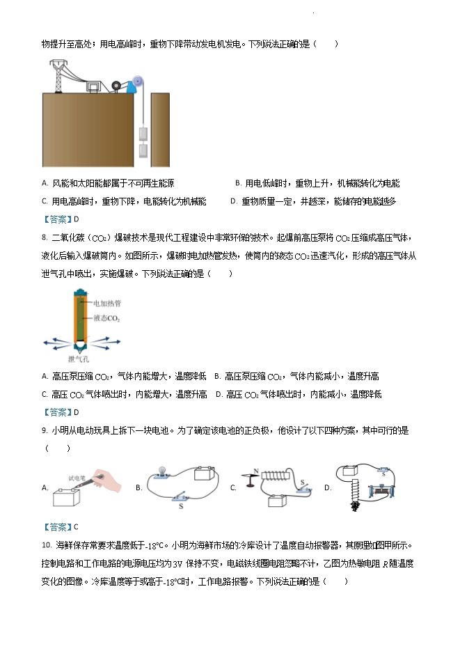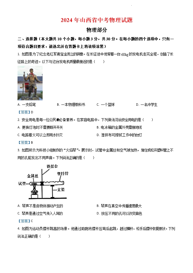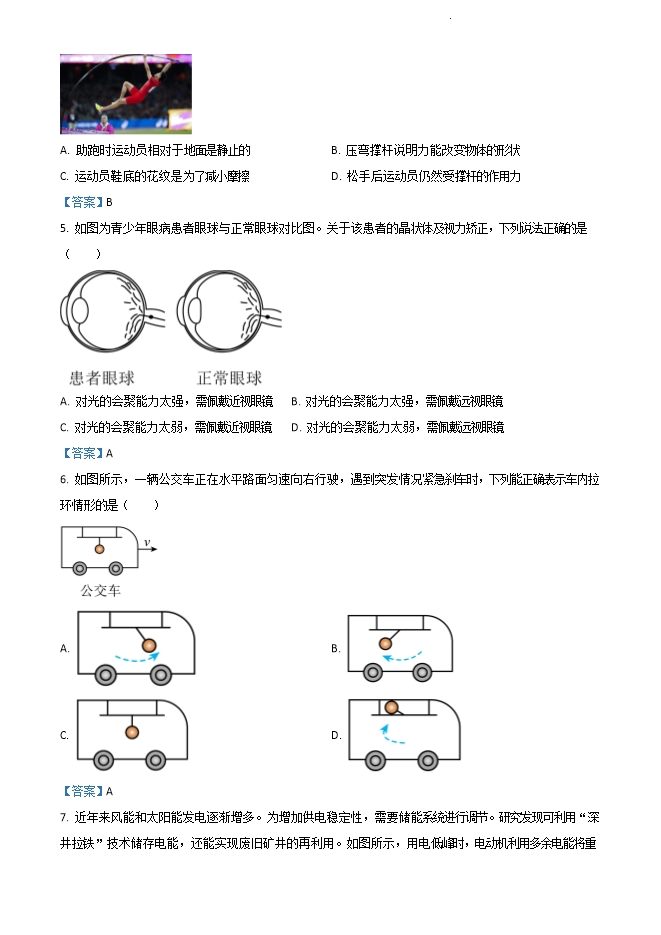 【内容简介】1. 如图是为了纪念老红军谢宝金而立的铜像。在长征途中他背着一台68kg的发电机走完全程,创造了长征路上的奇迹。以下与这台发电机质量最接近的是( ) A. 一支铅笔 B. 一本物理教科书 C. 一个篮球 D. 一名中学生【答案】D2. 安全用电是每一位公民 必备素养。在家庭电路中,下列做法符合安全用电的是( )A. 更换灯泡时不需要断开开关 B. 电冰箱的金属外壳需接地线C. 电路着火可以立即用水扑灭 D. 湿抹布可擦拭工作中的台灯【答案】B3. 如图所示为科技小组制作的“火焰琴”。展示时,试管中金属丝和空气被加热,堵住或松开塑料管上不同的孔能发出不同声音。下列说法正确的是( ) A. 琴声不是由物体振动产生的 B. 琴声在真空中传播速度最大C. 琴声是通过空气传入人耳的 D. 按压不同的孔可以改变音色【答案】C4. 如图为运动员撑杆跳高的场景。他通过助跑将撑杆压弯后起跳,越过横杆,松手后撑杆恢复原状。下列说法正确的是( ) A. 助跑时运动员相对于地面是静止的 B. 压弯撑杆说明力能改变物体的形状C. 运动员鞋底的花纹是为了减小摩擦 D. 松手后运动员仍然受撑杆的作用力【答案】B5. 如图为青少年眼病患者眼球与正常眼球对比图。关于该患者的晶状体及视力矫正,下列说法正确的是( ) A. 对光的会聚能力太强,需佩戴近视眼镜 B. 对光的会聚能力太强,需佩戴远视眼镜C. 对光的会聚能力太弱,需佩戴近视眼镜 D. 对光的会聚能力太弱,需佩戴远视眼镜【答案】A6. 如图所示,一辆公交车正在水平路面匀速向右行驶,遇到突发情况紧急刹车时,下列能正确表示车内拉环情形的是( )