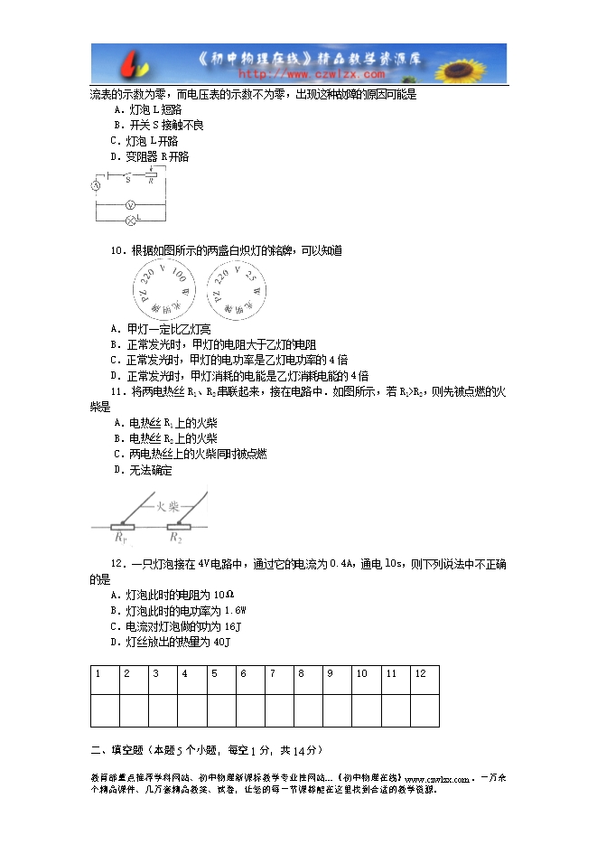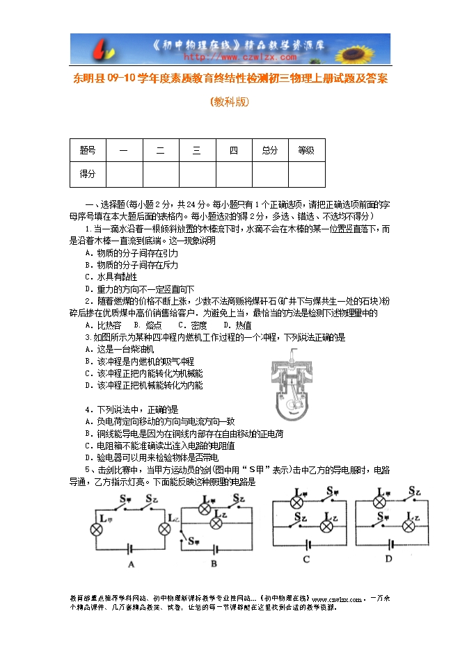 东明县09-10学年度素质教育终结性检测初三物理上册试题及答案(教科版)
