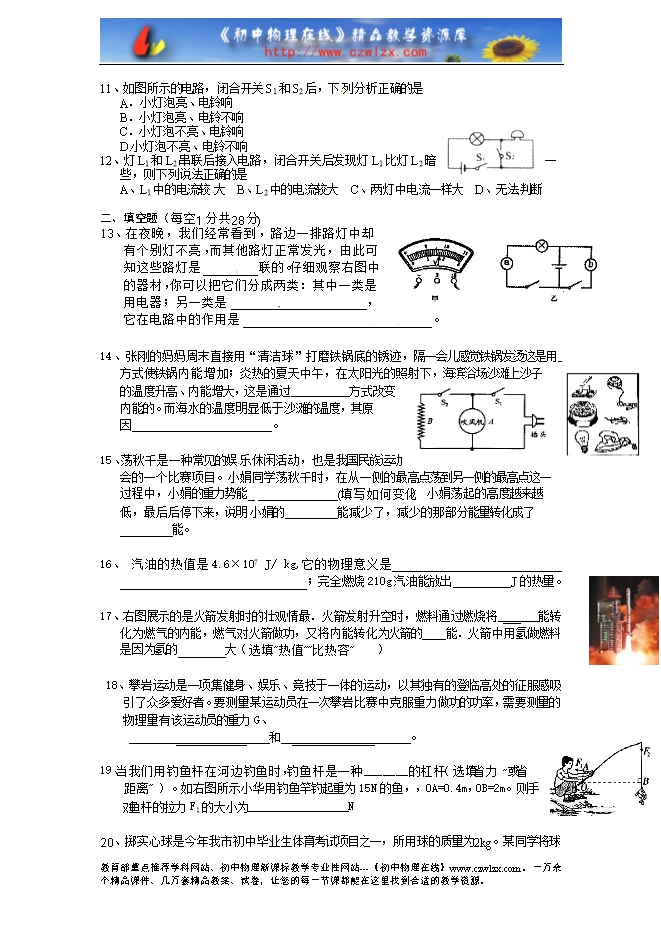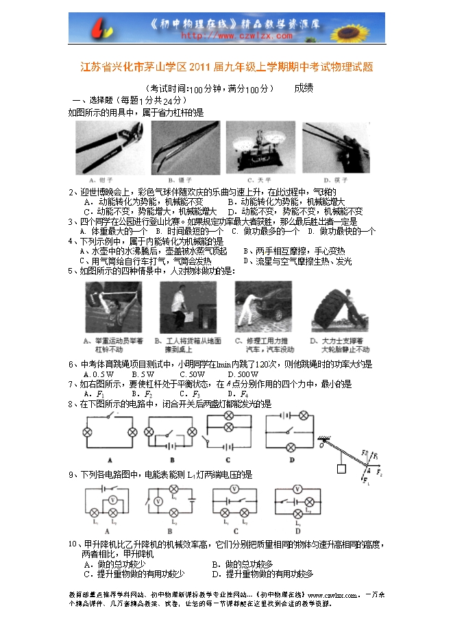江苏省兴化市茅山学区2011届九年级上学期期中考试物理试题及答案