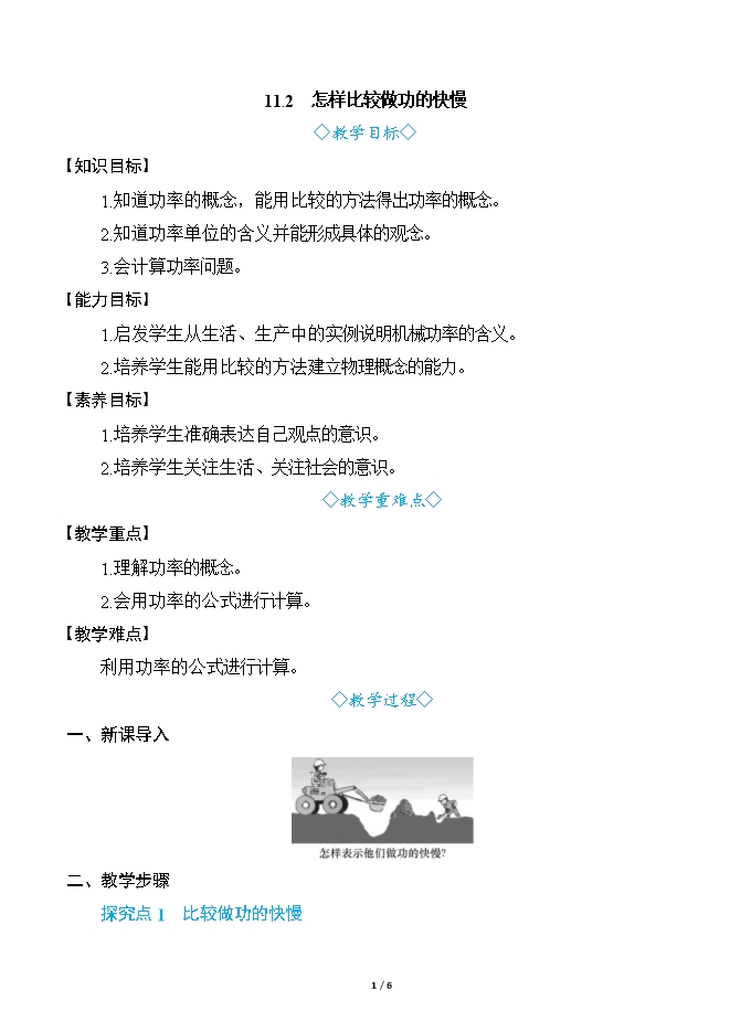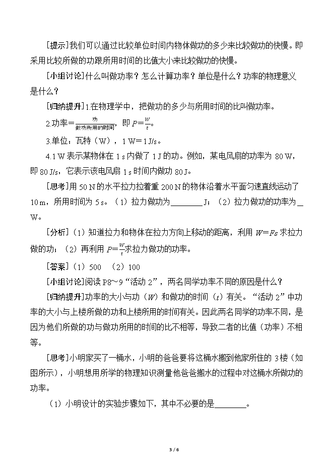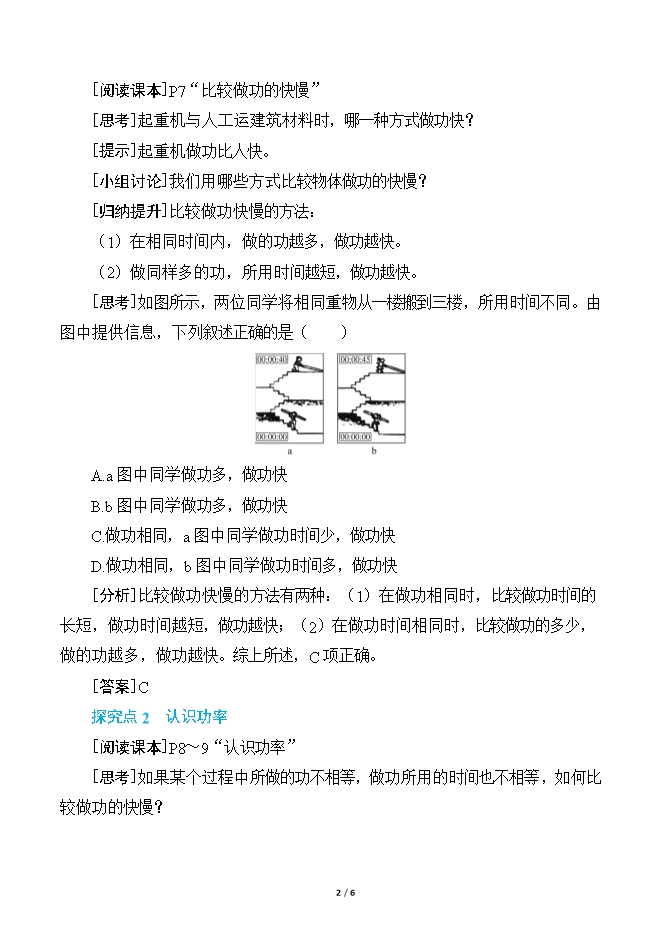 【内容简介】 知识目标 1.知道功率的概念,能用比较的方法得出功率的概念。2.知道功率单位的含义并能形成具体的观念。3.会计算功率问题。 能力目标 1.启发学生从生活、生产中的实例说明机械功率的含义。2.培养学生能用比较的方法建立物理概念的能力。 素养目标 1.培养学生准确表达自己观点的意识。2.培养学生关注生活、关注社会的意识。◇教学重难点◇ 教学重点 1.理解功率的概念。2.会用功率的公式进行计算。 教学难点 利用功率的公式进行计算。◇教学过程◇一、新课导入 二、教学步骤探究点1 比较做功的快慢[阅读课本]P7“比较做功的快慢”[思考]起重机与人工运建筑材料时,哪一种方式做功快?[提示]起重机做功比人快。[小组讨论]我们用哪些方式比较物体做功的快慢?[归纳提升]比较做功快慢的方法:(1)在相同时间内,做的功越多,做功越快。(2)做同样多的功,所用时间越短,做功越快。[思考]如图所示,两位同学将相同重物从一楼搬到三楼,所用时间不同。由图中提供信息,下列叙述正确的是( ) A.a图中同学做功多,做功快B.b图中同学做功多,做功快C.做功相同,a图中同学做功时间少,做功快D.做功相同,b图中同学做功时间多,做功快[分析]比较做功快慢的方法有两种:(1)在做功相同时,比较做功时间的长短,做功时间越短,做功越快;(2)在做功时间相同时,比较做功的多少,做的功越多,做功越快。综上所述,C项正确。[答案]C