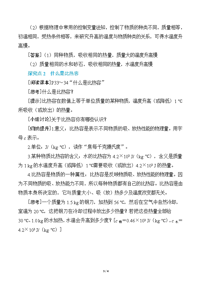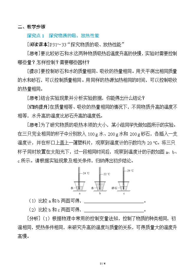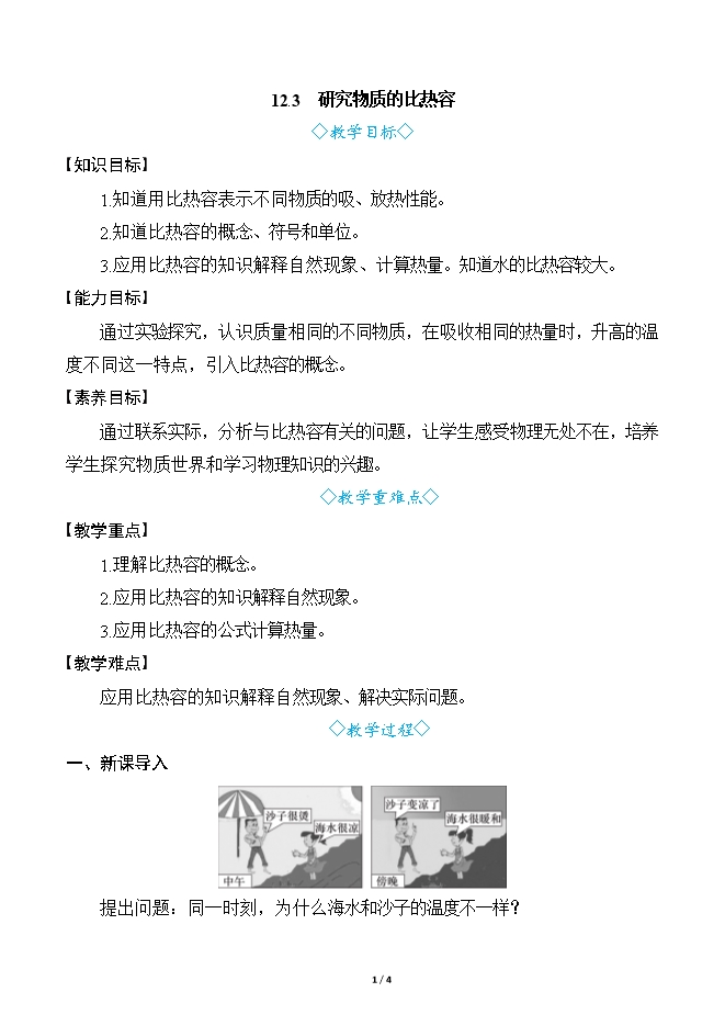 【内容简介】 知识目标 1.知道用比热容表示不同物质的吸、放热性能。2.知道比热容的概念、符号和单位。3.应用比热容的知识解释自然现象、计算热量。知道水的比热容较大。 能力目标 通过实验探究,认识质量相同的不同物质,在吸收相同的热量时,升高的温度不同这一特点,引入比热容的概念。 素养目标 通过联系实际,分析与比热容有关的问题,让学生感受物理无处不在,培养学生探究物质世界和学习物理知识的兴趣。◇教学重难点◇ 教学重点 1.理解比热容的概念。2.应用比热容的知识解释自然现象。3.应用比热容的公式计算热量。 教学难点 应用比热容的知识解释自然现象、解决实际问题。◇教学过程◇一、新课导入 提出问题:同一时刻,为什么海水和沙子的温度不一样?二、教学步骤探究点1 探究物质的吸、放热性能[阅读课本]P31~33“探究物质的吸、放热性能”[思考]要比较砂石和水这两种物质吸热后温度升高的快慢,实验时需要控制哪些量?怎样控制?需要哪些器材?[提示]要控制砂石和水的质量相同、吸收的热量相同。用天平测出相同质量的水和砂石,可以控制质量相同。用同样的热源加热相同的时间,可以控制吸收的热量相同。[思考]结合实验现象并分析实验数据,你能得出什么结论?[归纳提升]在质量相等、吸收的热量相同的情况下,不同物质升高的温度不相等,水升高的温度比砂石升高的温度低。[思考]为了研究物质的吸热本领的大小,某小组同学先做如图所示的实验:在三只完全相同的杯子中分别放入100 g水、200 g水和200 g砂石,各插入一支温度计,并在杯口上盖上一薄塑料片,观察到温度计的示数均为20 ℃。将三只杯子同时放置在太阳光下,过一段相同时间后,观察到温度计的示数如图a、b、c所示。请根据实验现象及相关条件,归纳得出初步结论。