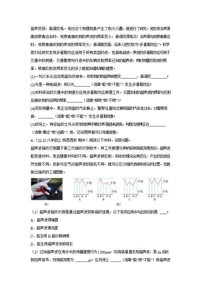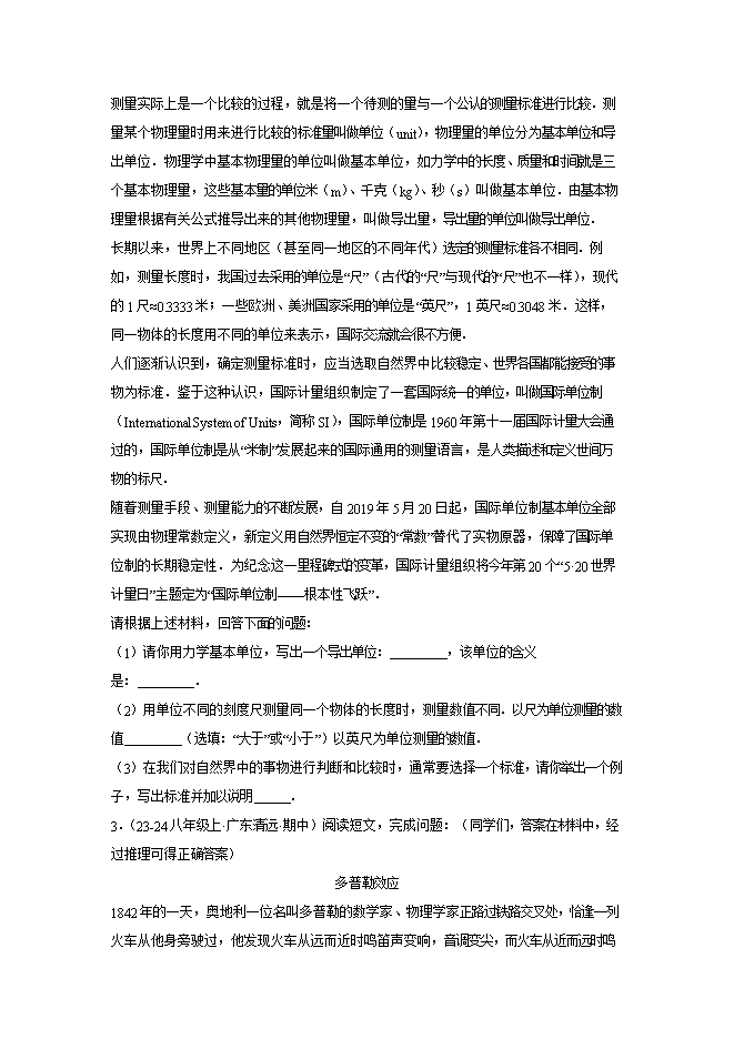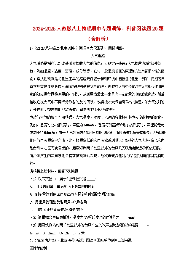 【内容简介】大气遥感大气遥感是指在远距离处感应接收大气的信息,以测定远处表示大气物理状态的各种参数,例如温度、温度、密度、成分等等。它与一般常规观测的原理和方法有着根本性的区别。常规性观测是将测量工具的感应元件置于被测环境中直接进行测量,例如,用刻度尺直接测量物体的长度。遥感探测则是根据电磁波、声波在大气中传输时与大气相互作用产生的效应进行间接测量的,例如,从测量点发出一束具有一定能量的电磁波或声波,然后接收它被大气中不同成分散射的反向回波,或者接收大气自身发出的信息,如大气发射的红外辐射、微波辐射及次声波,间接测出各种大气参数。声波与大气的相互作用很强,大气温度、湿度、风速的变化将引起声波传播速度的变化。例如,温度为15摄氏度时,声速为 ,温度每升高或降低1摄氏度时,声速将增大或减小约 。由于大气对声波的吸收作用也很强,所以声波能量衰减很快,大气吸收作用与声波频率平方成正比,故频率低的次声波能遥测很远距离处的大气状态。台风次声是台风中心区海浪发出的,距离海岸两千公里以外的台风几天以后会到达海岸的观测站,而台风产生的次声波则会提前被观测站发现,故次声波探测对台风的监视和预报都是有用的。请根据上述材料,回答下列问题(1)以下实验中,属于间接测量的是 ;A.用停表测量小车沿斜面下滑需要的时间B.倒车雷达利用回声测出汽车尾部和障碍物之间的距离C.用量角器测量反射现象中的反射角D.用温度计测量海波熔化时的温度(2)请根据文中信息推算,温度为30摄氏度时的声速约为 ;(3)距离观测站约两千公里以外的台风产生的次声波到达观测站约需要 。A.2s B.2min C.2h D.2天2.(20-21九年级下·北京·开学考试)阅读《国际单位制》回答问题.国际单位制测量实际上是一个比较的过程,就是将一个待测的量与一个公认的测量标准进行比较.测量某个物理量时用来进行比较的标准量叫做单位(unit),物理量的单位分为基本单位和导出单位.物理学中基本物理量的单位叫做基本单位,如力学中的长度、质量和时间就是三个基本物理量,这些基本量的单位米(m)、千克(kg)、秒(s)叫做基本单位.由基本物理量根据有关公式推导出来的其他物理量,叫做导出量,导出量的单位叫做导出单位.长期以来,世界上不同地区(甚至同一地区的不同年代)选定的测量标准各不相同.例如,测量长度时,我国过去采用的单位是“尺”(古代的“尺”与现代的“尺”也不一样),现代的1尺≈0.3333米;一些欧洲、美洲国家采用的单位是“英尺”,1英尺≈0.3048米.这样,同一物体的长度用不同的单位来表示,国际交流就会很不方便.
