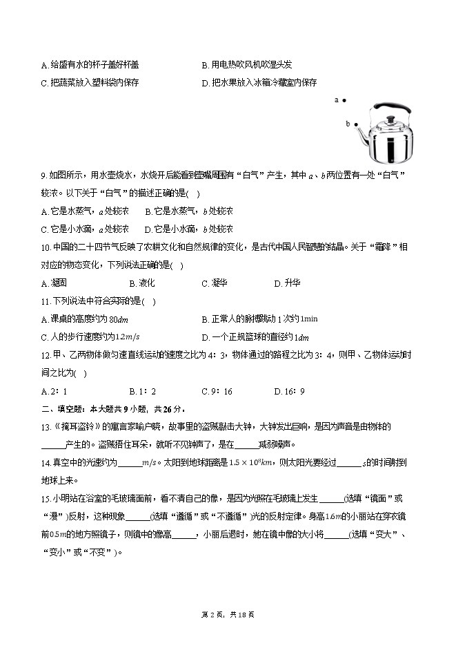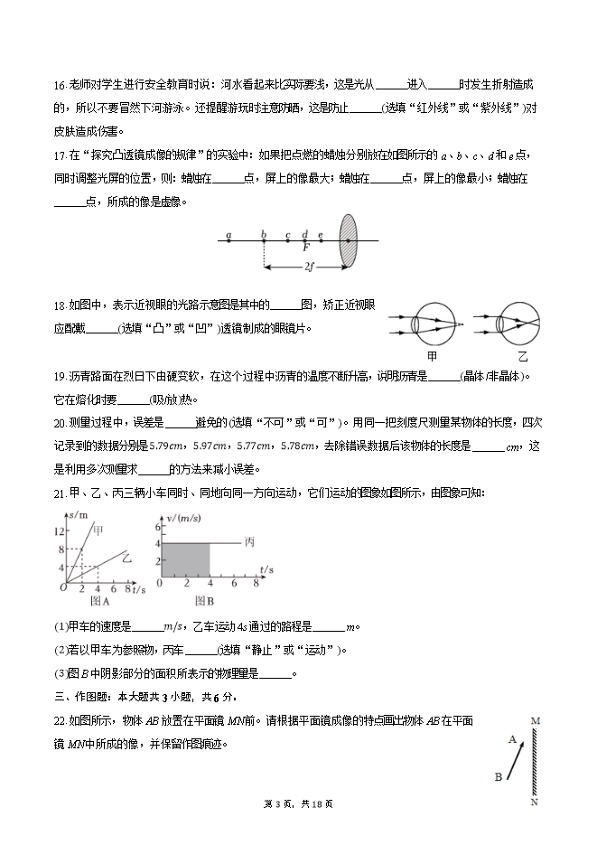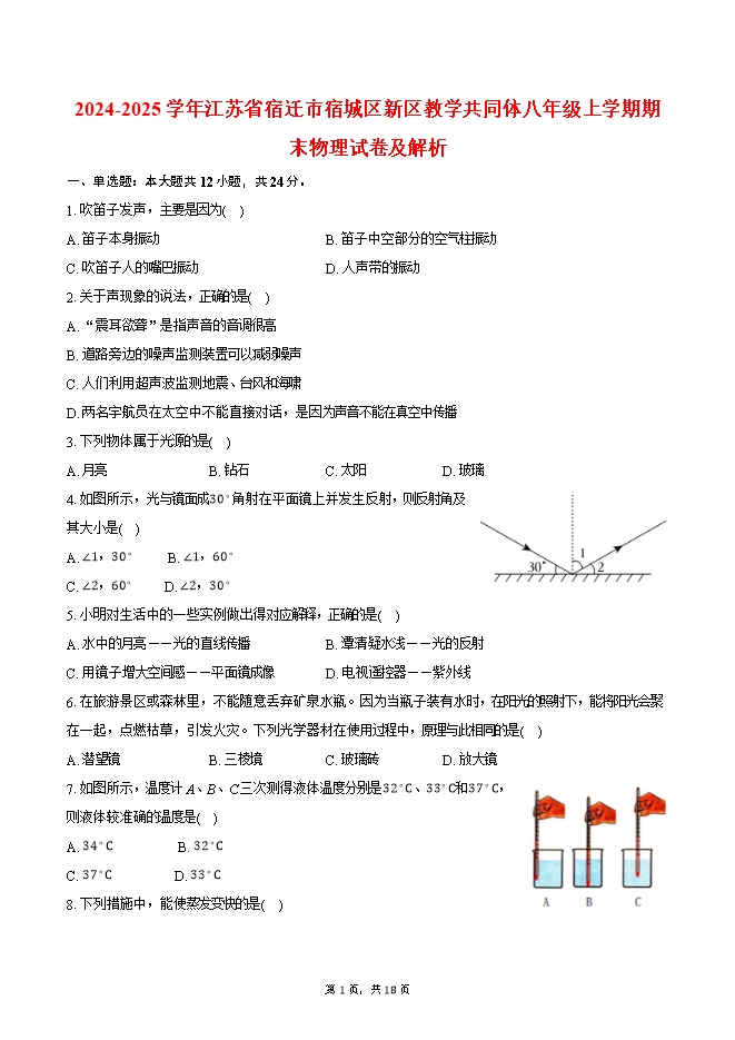 【内容简介】1.吹笛子发声,主要是因为( )A. 笛子本身振动 B. 笛子中空部分的空气柱振动C. 吹笛子人的嘴巴振动 D. 人声带的振动2.关于声现象的说法,正确的是( )A. “震耳欲聋”是指声音的音调很高B. 道路旁边的噪声监测装置可以减弱噪声C. 人们利用超声波监测地震、台风和海啸D. 两名宇航员在太空中不能直接对话,是因为声音不能在真空中传播3.下列物体属于光源的是( )A. 月亮 B. 钻石 C. 太阳 D. 玻璃4.如图所示,光与镜面成30^∘角射在平面镜上并发生反射,则反射角及其大小是( )A. ∠1,30^∘ B. ∠1,60^∘C. ∠2,60^∘ D. ∠2,30^∘5.小明对生活中的一些实例做出得对应解释,正确的是( )A. 水中的月亮——光的直线传播 B. 潭清疑水浅——光的反射C. 用镜子增大空间感——平面镜成像 D. 电视遥控器——紫外线6.在旅游景区或森林里,不能随意丢弃矿泉水瓶。因为当瓶子装有水时,在阳光的照射下,能将阳光会聚在一起,点燃枯草,引发火灾。下列光学器材在使用过程中,原理与此相同的是( )A. 潜望镜 B. 三棱境 C. 玻璃砖 D. 放大镜7.如图所示,温度计 A、B、C三次测得液体温度分别是32^∘ C、33^∘ C和37^∘ C,则液体较准确的温度是( )A. 34^∘ C B. 32^∘ CC. 37^∘ C D. 33^∘ C8.下列措施中,能使蒸发变快的是( )