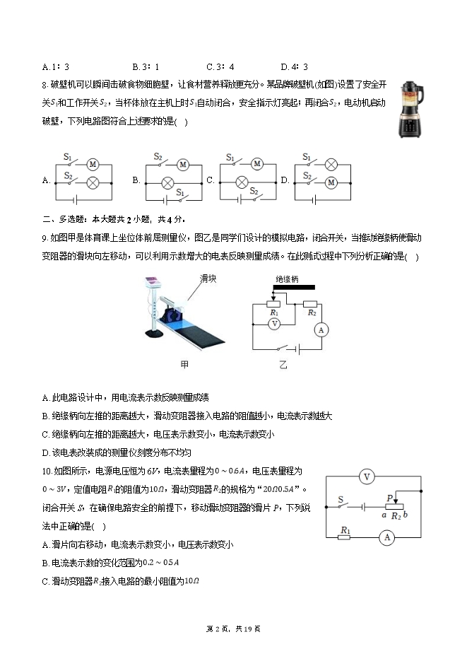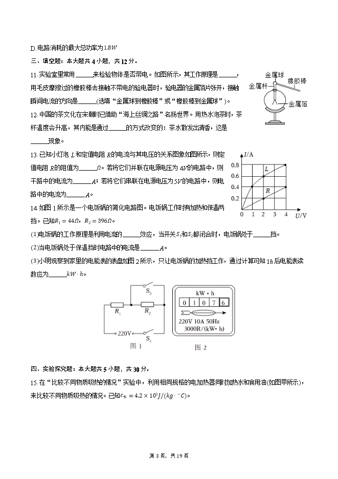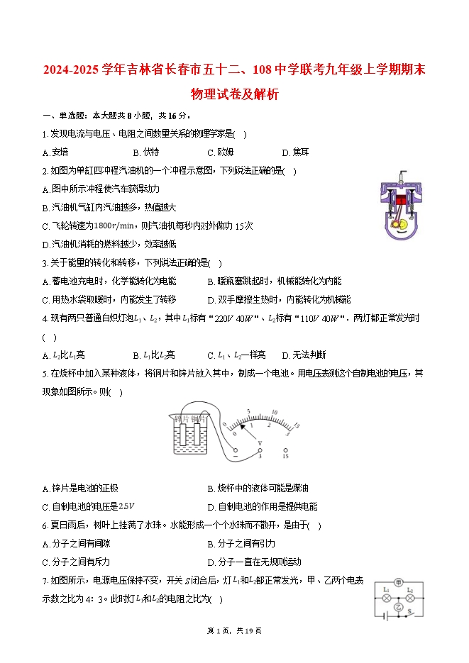 【内容简介】1.发现电流与电压、电阻之间数量关系的物理学家是( )A. 安培 B. 伏特 C. 欧姆 D. 焦耳2.如图为单缸四冲程汽油机的一个冲程示意图,下列说法正确的是( )A. 图中所示冲程使汽车获得动力B. 汽油机气缸内汽油越多,热值越大C. 飞轮转速为1800r/min,则汽油机每秒内对外做功15次D. 汽油机消耗的燃料越少,效率越低3.关于能量的转化和转移,下列说法正确的是( )A. 蓄电池充电时,化学能转化为电能 B. 暖瓶塞跳起时,机械能转化为内能C. 用热水袋取暖时,内能发生了转移 D. 双手摩擦生热时,内能转化为机械能4.现有两只普通白炽灯泡L_1、L_2,其中L_1标有“220V 40W“、L_2标有“110V 40W“.两灯都正常发光时( )A. L_2比L_1亮 B. L_1比L_2亮 C. L_1、L_2一样亮 D. 无法判断5.在烧杯中加入某种液体,将铜片和锌片放入其中,制成一个电池。用电压表测这个自制电池的电压,其现象如图所示。则( )A. 锌片是电池的正极 B. 烧杯中的液体可能是煤油C. 自制电池的电压是2.5V D. 自制电池的作用是提供电能6.夏日雨后,树叶上挂满了水珠。水能形成一个个水珠而不散开,是由于( )A. 分子之间有间隙 B. 分子之间有引力C. 分子之间有斥力 D. 分子一直在无规则运动