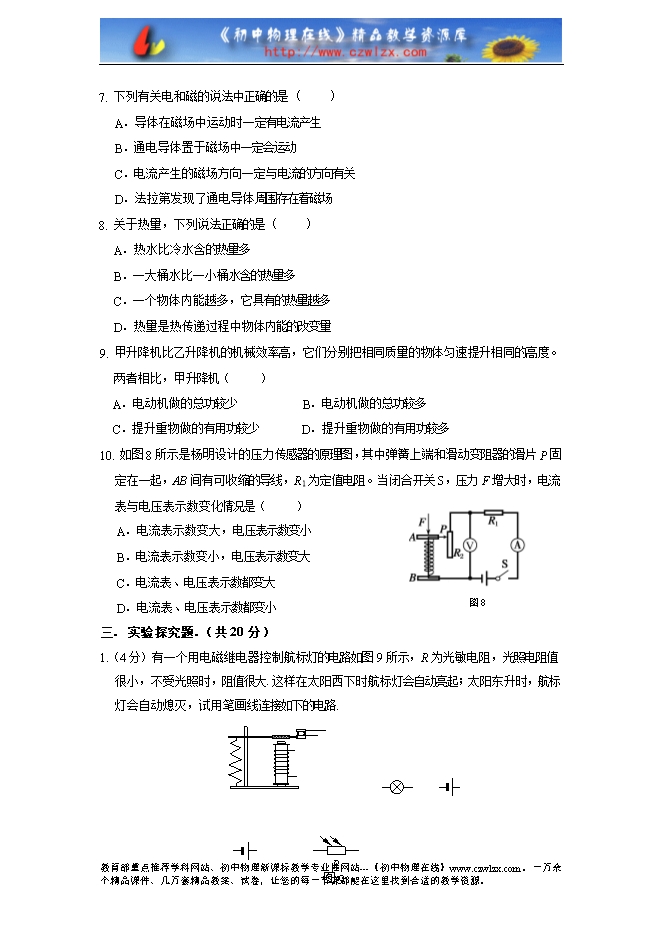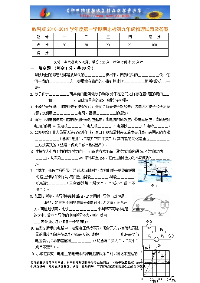 教科版2010-2011学年度第一学期期末检测九年级物理试题及答案