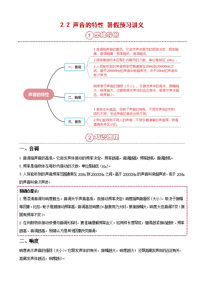 【2025-2026暑假预习讲义】2.2 声音的特性---人教版八年级上册物理(附答案)