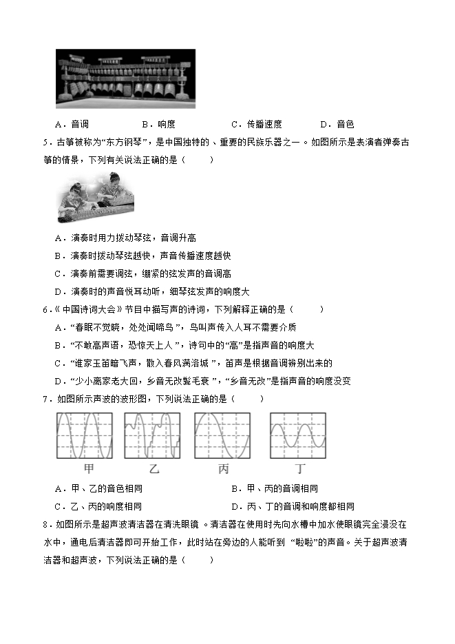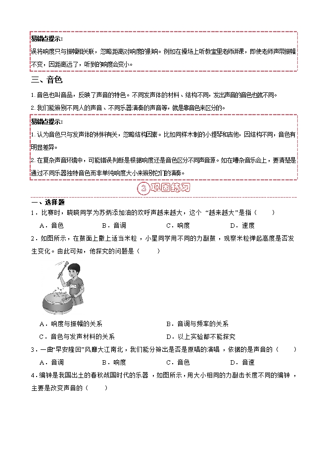 【内容简介】一、音调1.音调指声音的高低。它由发声体振动的频率决定,频率越高,音调越高;频率越低,音调越低。2.频率是指物体在每秒内振动的次数,单位是赫兹(Hz)。3.人耳能听到的声音频率范围通常在20Hz到20000Hz之间。高于20000Hz的声音叫做超声波,低于20Hz的声音叫做次声波。易错点提示:1.易混淆音调与响度概念。音调关乎声音高低,由振动频率决定;响度指声音强弱(大小),取决于振幅等因素。比如,蚊子翅膀振动频率高,音调高但响度小;敲鼓用力大时,鼓面振幅大,响度大但音调不变(鼓固有频率不变)。2.在判断物体振动快慢与音调关系时,要准确理解频率含义。如同样长度琴弦,绷得越紧振动越快、频率越高、音调越高,别错认为是其他因素改变音调。二、响度响度表示声音的强弱(大小)。它跟发声体的有关,振幅越大,响度越大;还跟距离发声体的远近有关,距离发声体越远,响度越小。易错点提示:误将响度只与振幅相关联,忽略距离对响度的影响。例如在操场上听教室里老师讲课,即使老师声带振幅不变,因距离远了,听到的响度会变小。三、音色1.音色也叫音品,反映了声音的特色。不同发声体的材料、结构不同,发出声音的音色也就不同。2.我们能辨别不同人的声音、不同乐器演奏的声音等,就是靠音色来区分的。易错点提示:1.认为音色只与发声体的材料有关,忽略结构因素。比如同样木制的小提琴和吉他,因结构不同,音色有明显差异。2.在复杂声音环境中,可能错误判断是根据响度还是音色区分不同声音源。如在嘈杂音乐会上,要清楚是通过不同乐器独特音色而非单纯响度大小来辨别它们的演奏。 巩固练习一、选择题1.比赛时,晓晓同学为苏炳添加油的欢呼声越来越大,这个“越来越大”是指(  )A.音色 B.音调 C.响度 D.速度2.如图所示,在鼓面上撒上适当米粒,小星同学用不同的力敲鼓,观察米粒弹起高度是否发生变化。由此可知,他探究的问题是(  )