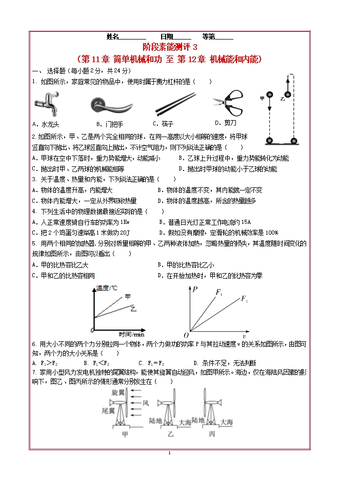 - 2382025-2026学年苏科版物理九年级上册同步练习:第十二章 机械能和内能 随堂小测(附答案)