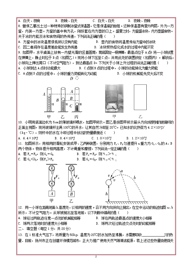 - 3082025-2026学年苏科版物理九年级上册阶段素能测评卷:第12章 机械能和内能(附答案)