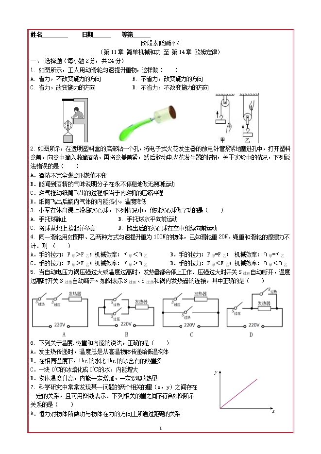 2025-2026学年苏科版物理九年级上册阶段素能测评卷:第11章 简单机械和功 至 第14章 欧姆定律(附答案)