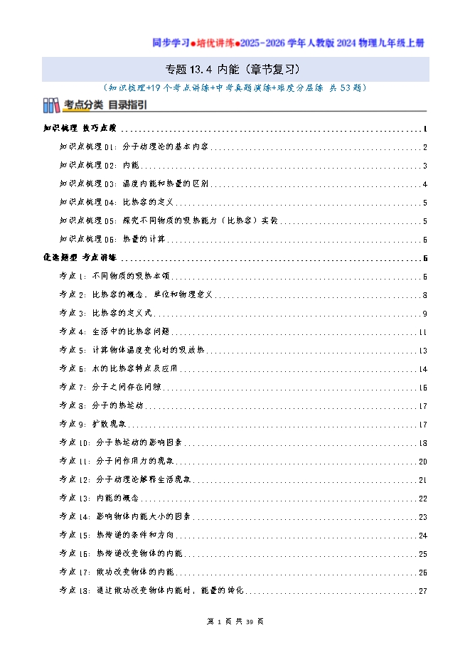 - 181专题13.3 内能--2025-2026人教版物理九年级全一册同步学习 培优讲练:知识梳理+考点讲练+中考…