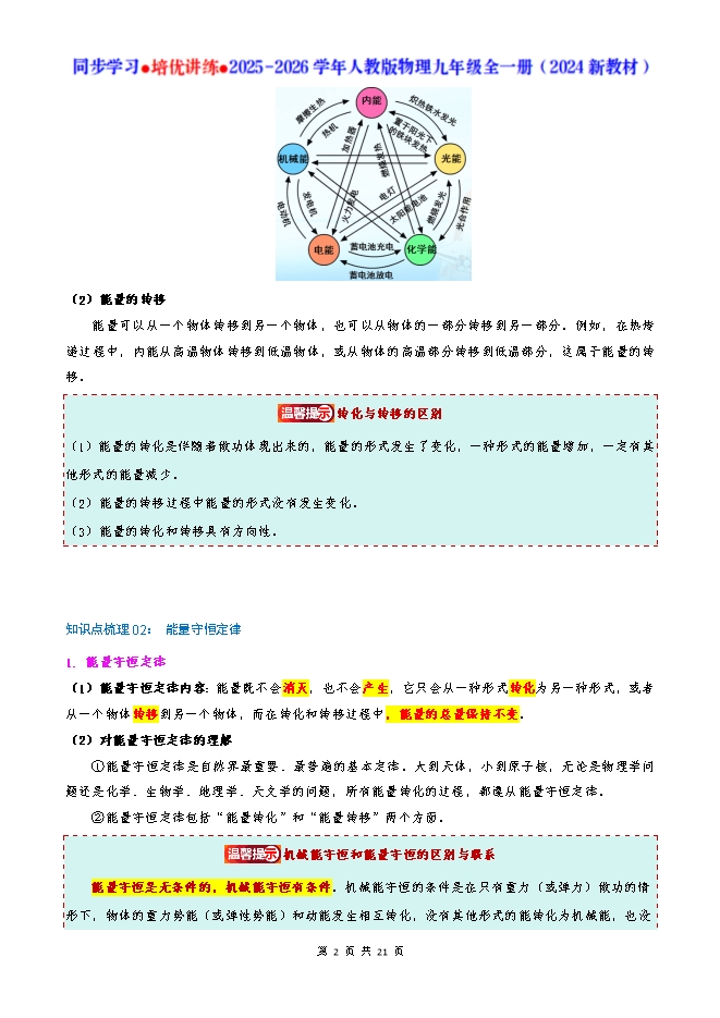 【内容简介】知识点梳理02: 能量守恒定律1. 能量守恒定律(1)能量守恒定律内容:能量既不会消灭,也不会产生,它只会从一种形式转化为另一种形式,或者从一个物体转移到另一个物体,而在转化和转移过程中,能量的总量保持不变。(2)对能量守恒定律的理解①能量守恒定律是自然界最重要、最普遍的基本定律。大到天体,小到原子核,无论是物理学问题还是化学、生物学、地理学、天文学的问题,所有能量转化的过程,都遵从能量守恒定律。②能量守恒定律包括“能量转化”和“能量转移”两个方面。 机械能守恒和能量守恒的区别与联系能量守恒是无条件的,机械能守恒有条件。机械能守恒的条件是在只有重力(或弹力)做功的情形下,物体的重力势能(或弹性势能)和动能发生相互转化,没有其他形式的能转化为机械能,也没有机械能转化为其他形式的能。2. 永动机(1)永动机:不需要动力就能源源不断地对外做功的机器,人们把这种机器叫做永动机。(2)永动机不可能实现。事实证明,能量在转化过程中只要有运动,摩擦就是不可避免的,从而产生热,这样运动的能量就会减少,如果不补充能量,运动就会停止。永动机违背了能量守恒定律,是不可能研制成功的。