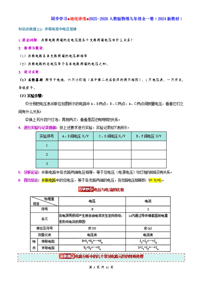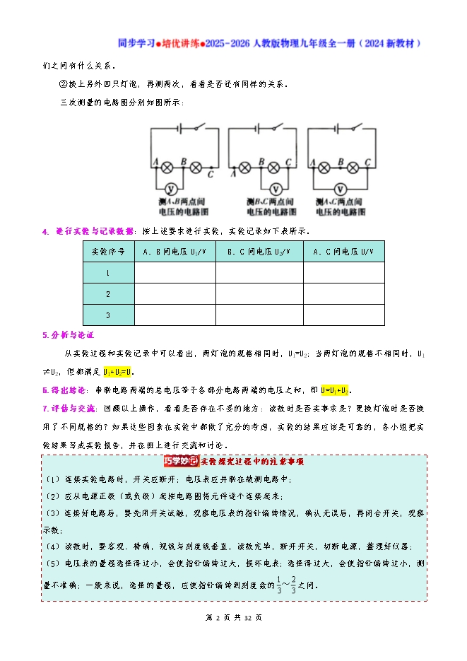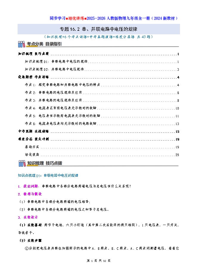 专题16.2 串、并联电路中电压的规律--2025-2026人教版物理九年级全一册同步学习 培优讲练:知识梳理+考点讲练+中考真题演练+难度分层(试题版和答案版)