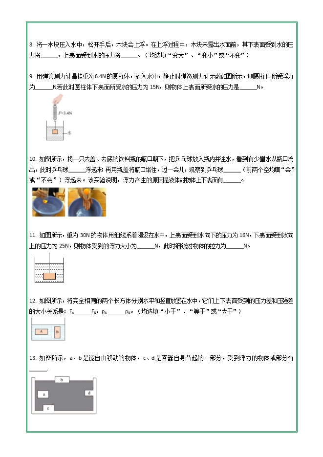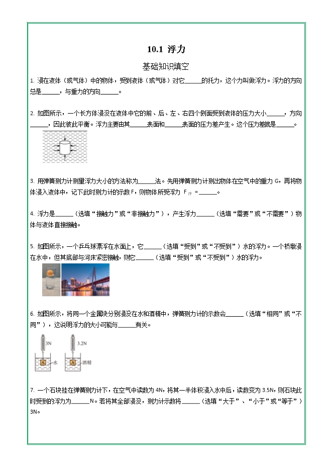 【内容简介】第十章 第一节 浮力—2025-2026学年人教版物理八年级下学期预习基础知识填空(附答案)