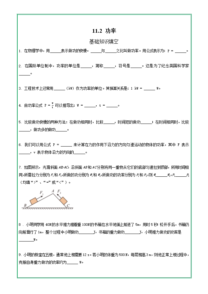 【内容简介】第十一章 第二节 功率—2025-2026学年人教版物理八年级下学期预习基础知识填空(附答案)