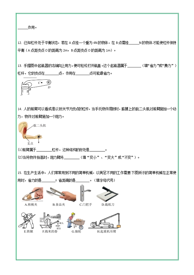 第十二章 第一节 杠杆—2025-2026学年人教版物理八年级下学期预习基础知识填空(附答案)