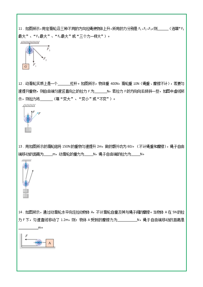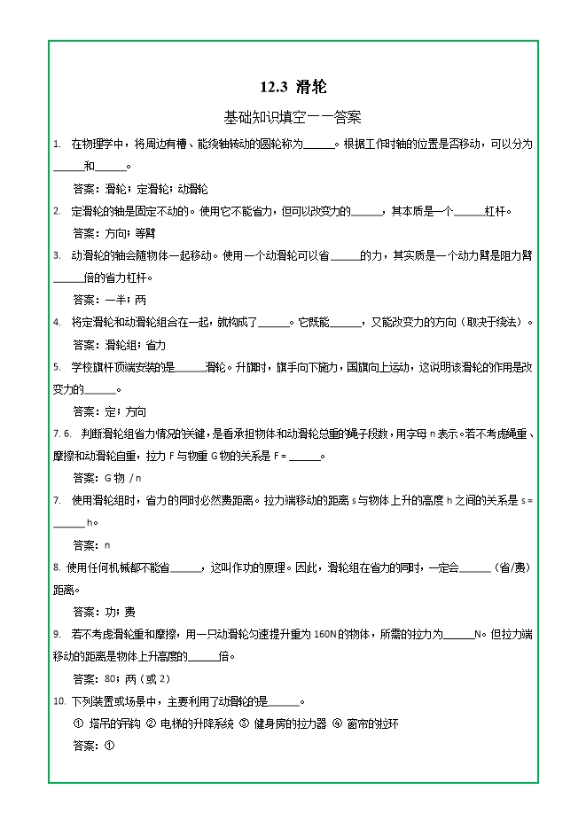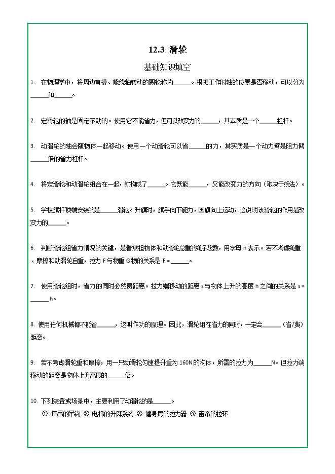 第十二章 第三节 滑轮—2025-2026学年人教版物理八年级下学期预习基础知识填空(附答案)