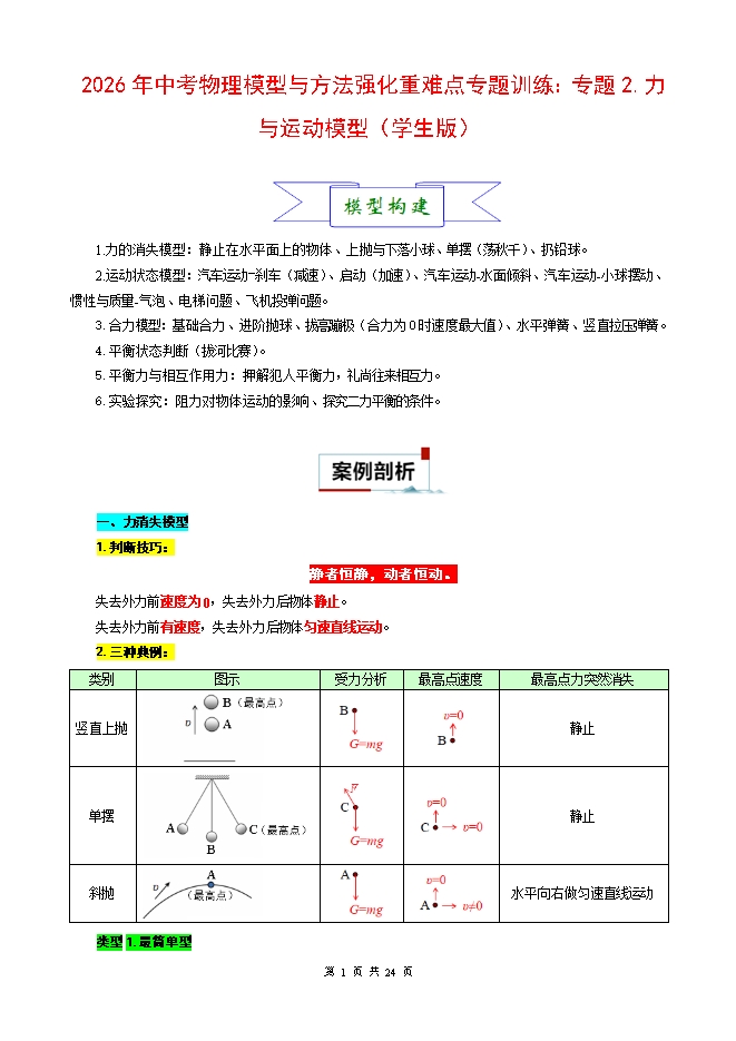 【内容简介】2026年中考物理模型与方法强化重难点专题训练:专题2.力与运动模型(学生版和教师版)